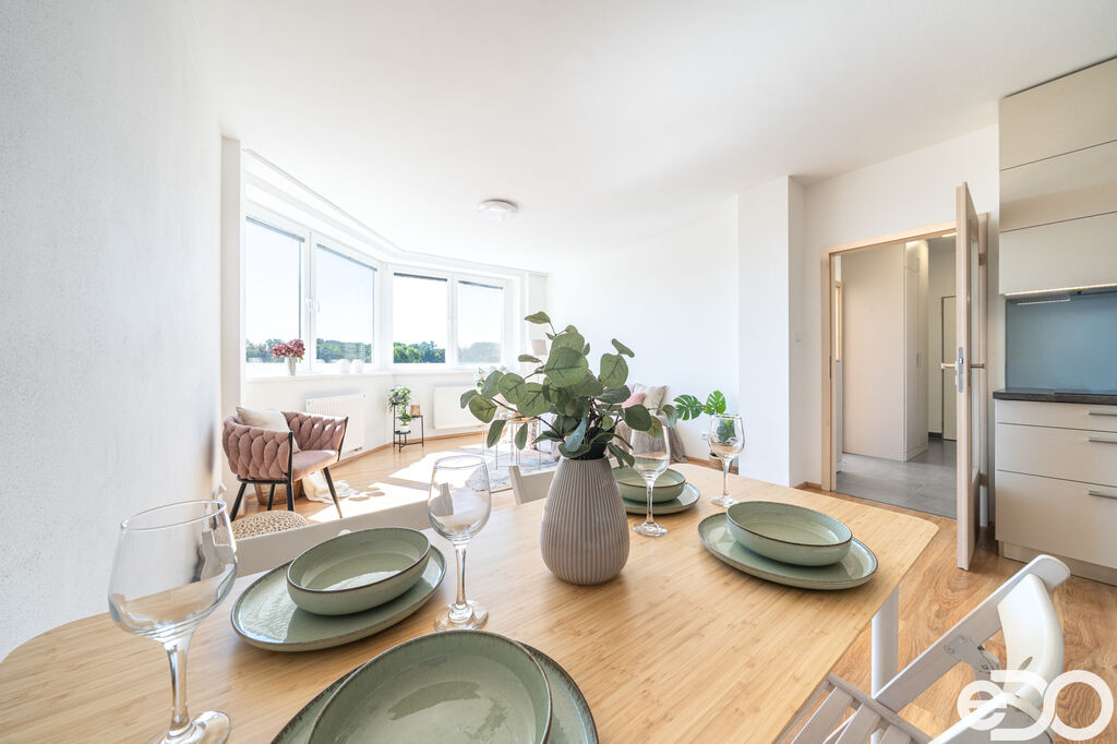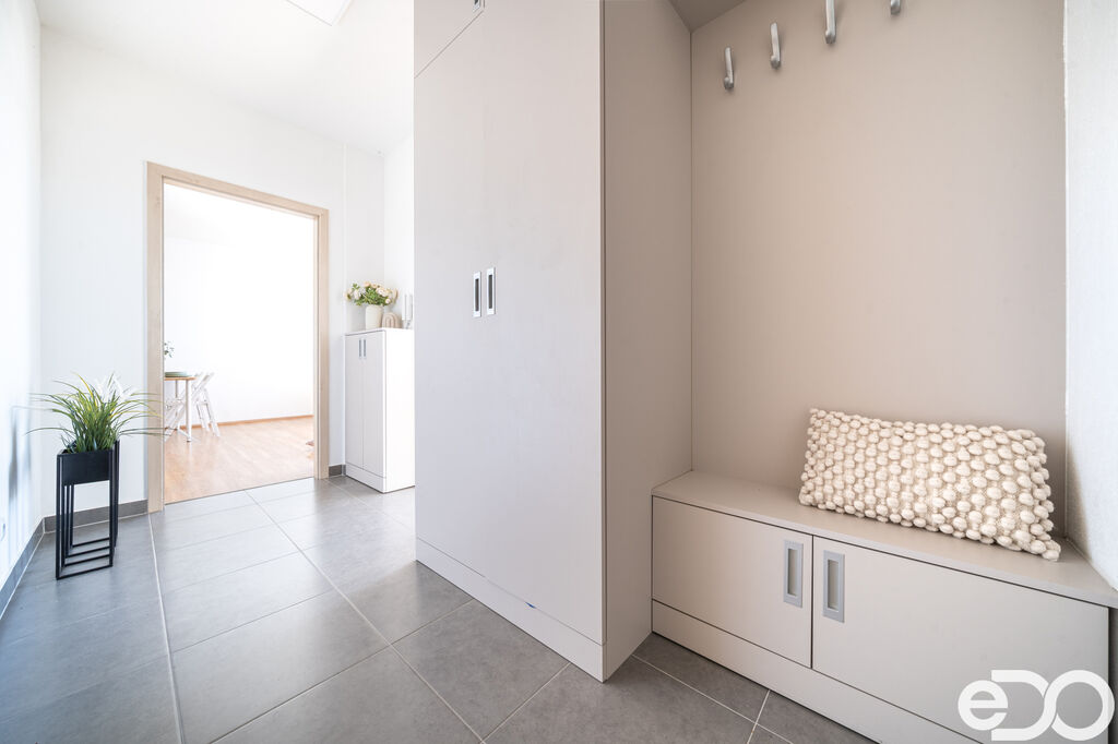 Interiér je řešen velmi prakticky – součástí je kvalitní kuchyňská linka zhotovená na míru, která poskytuje dostatek úložného i pracovního prostoru. Velký balkon je ideálním místem pro odpočinek či posezení s přáteli.