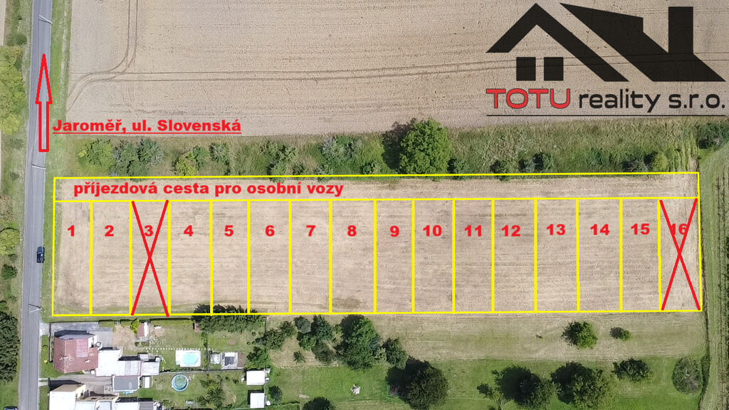 Nabízíme k pronájmu zahrady v Jaroměři, městská část Cihelny, ul. Slovenská. Na rovinatém pozemku kousek od centra obce, přesto v klidné lokalitě jsme pro vás připravili soubor 16 zahrad s výměrou od 350 m2, kde naleznete slunné místo pro odpočinek i vlastní úrodu. Zahrady se pronajímají částečně oplocené s napojením na městský vodovodní řád. S nájemci bude uzavřena nájemní smlouva na tříleté období s automatickou prolongací na další období. Hledáme dlouhodobé nájemce. Cena měsíčního nájemného je stanovena ve výši 2.500 Kč + záloha na vodu. Jednorázová provize zprostředkovatele ve výši 5.000 Kč. Doporučujeme prohlídku. Více informací u makléře.
