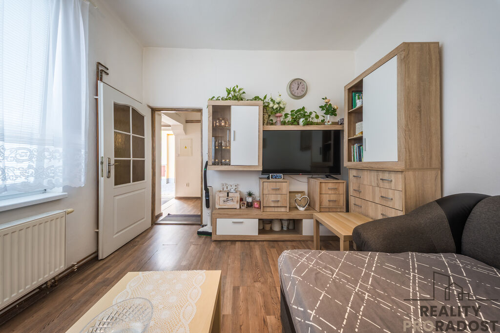 Bytová jednotka 3+1 – 1. NP - kuchyně, prostorný obývací pokoj s krbem, koupelna se sprchovým koutem a WC.