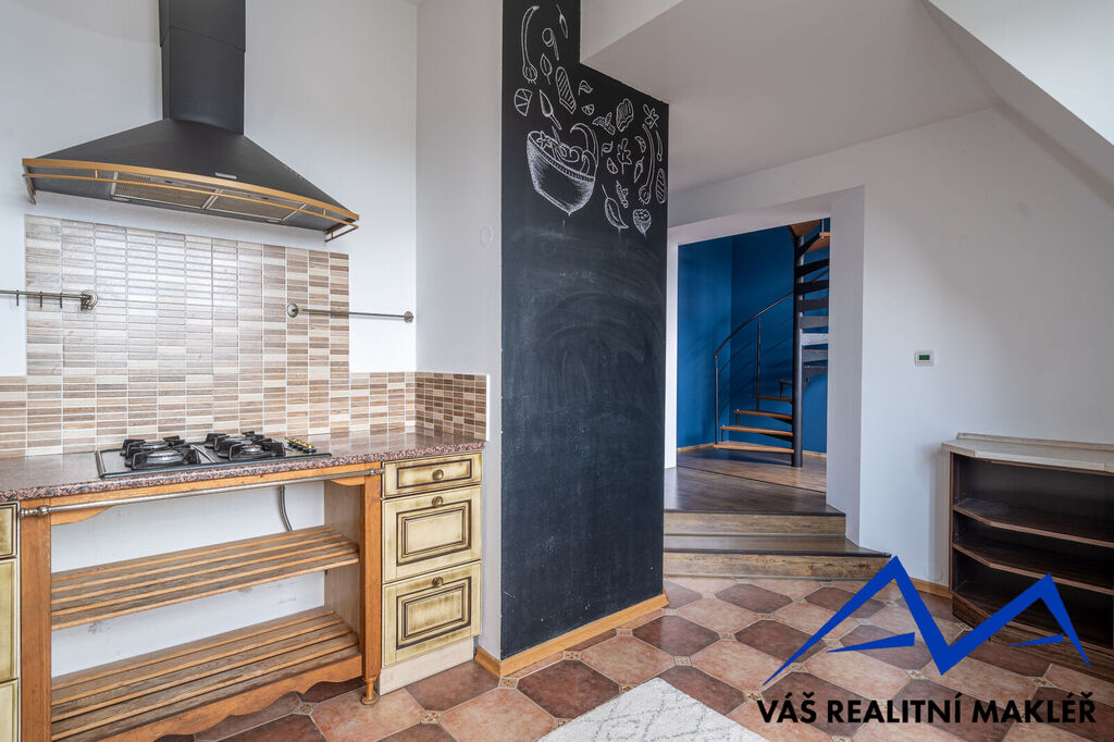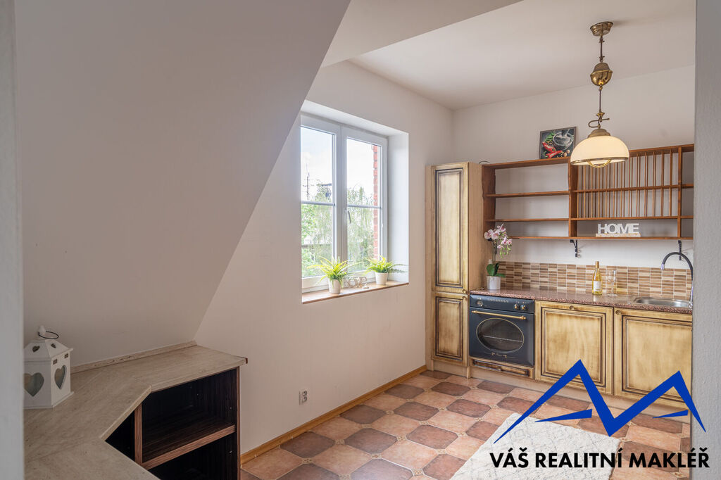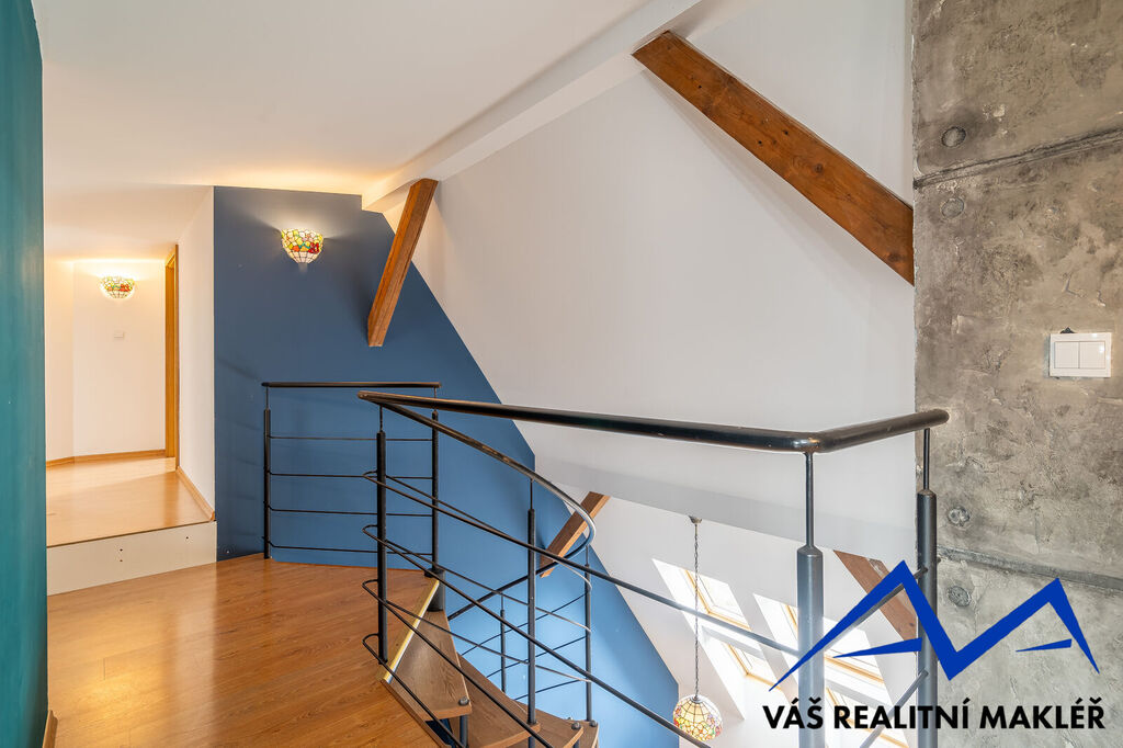 2. patro bytu - obývací pokoj, koupelna s vanou a WC, ložnice, šatna, 2x pokoj, 2x půdní prostor.