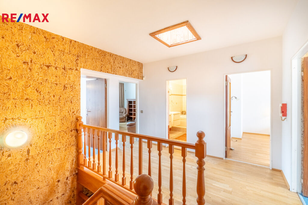 Patro: čtyři ložnice, prostorná koupelna s rohovou vanou a dvěma umyvadly.