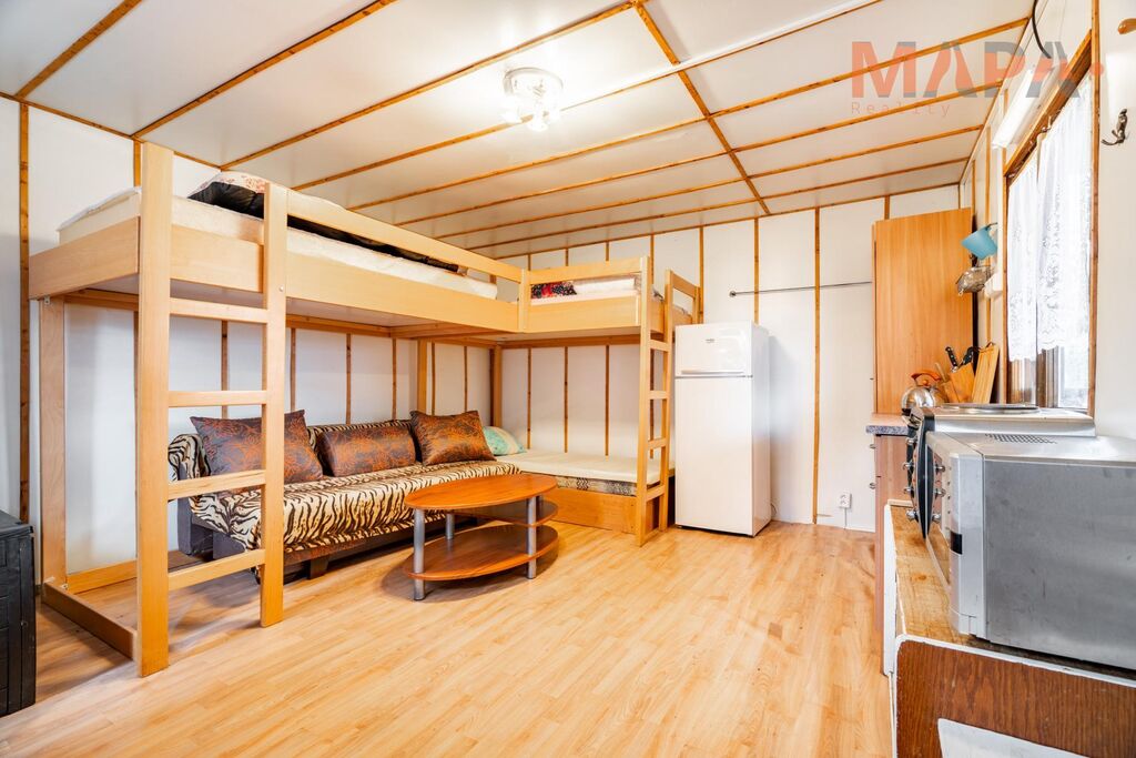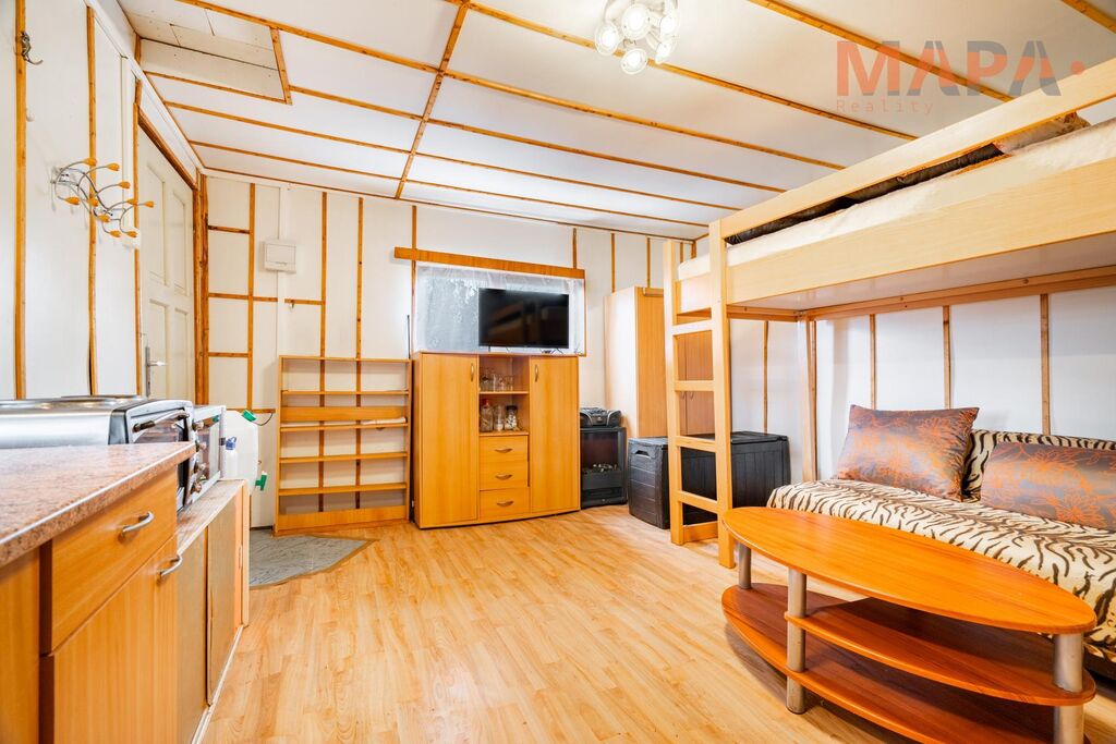 Vybavená chatka: postele, televize, lednice, trouba, mikrovlnka, kuchyňská linka, skříně