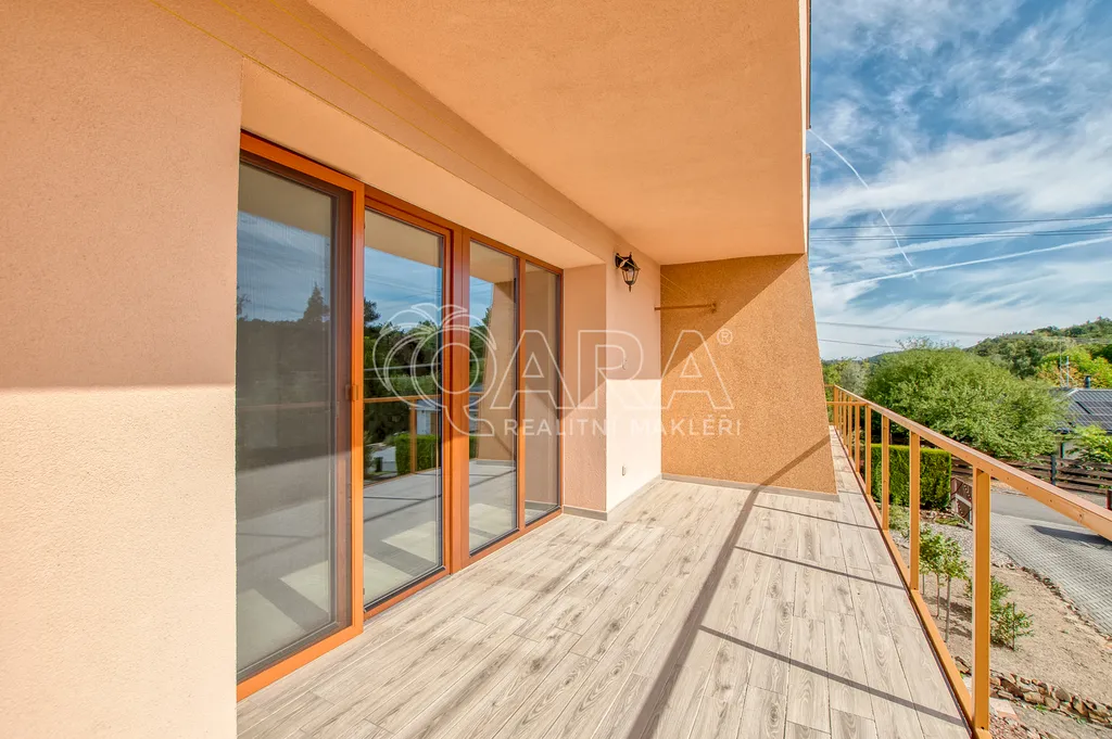 V patře se nachází dalších 115 m² s dispozicí 4+1. Jsou zde čtyři neprůchozí pokoje, obývací pokoj o rozloze 32 m² s krbem a vstupem na balkon (11 m²), kuchyně s jídelnou o velikosti 19 m², koupelna s vanou a samostatná toaleta. Ložnice o velikosti 16 m² má vlastní balkon o ploše 7 m² orientovaný na jih. Část pokojů je již zrekonstruovaná, například dětský pokoj s novou elektroinstalací, sádrokartonovým stropem a vinylovou podlahou. Většina domu má nová eurookna s izolačním trojsklem.