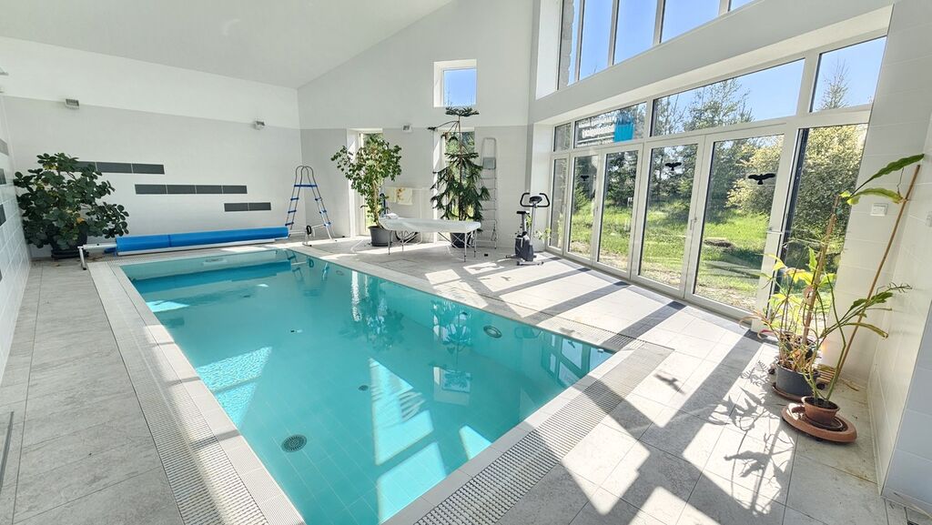 Prostorný vnitřní bazén s pohodovým venkovním posezením.