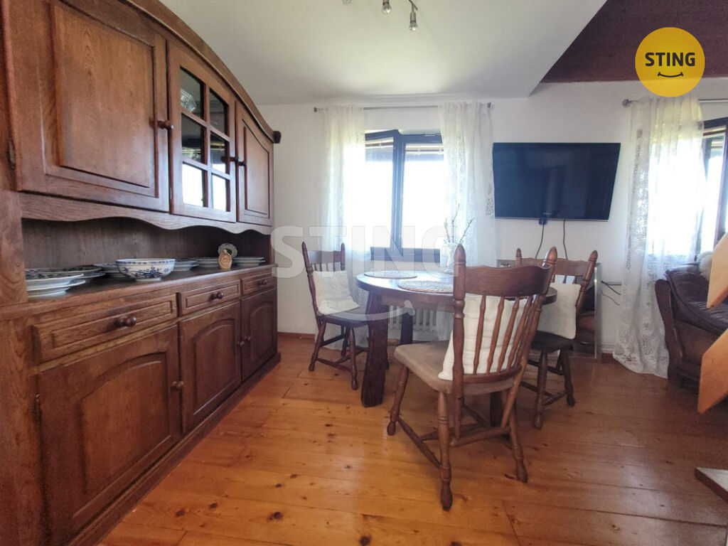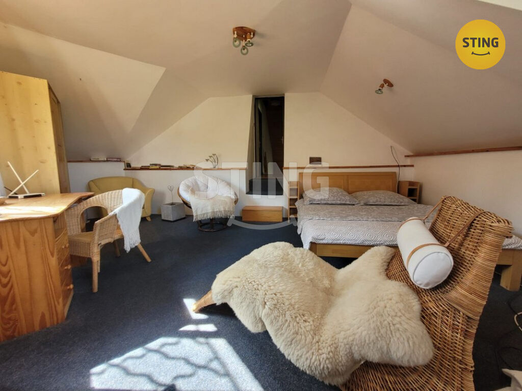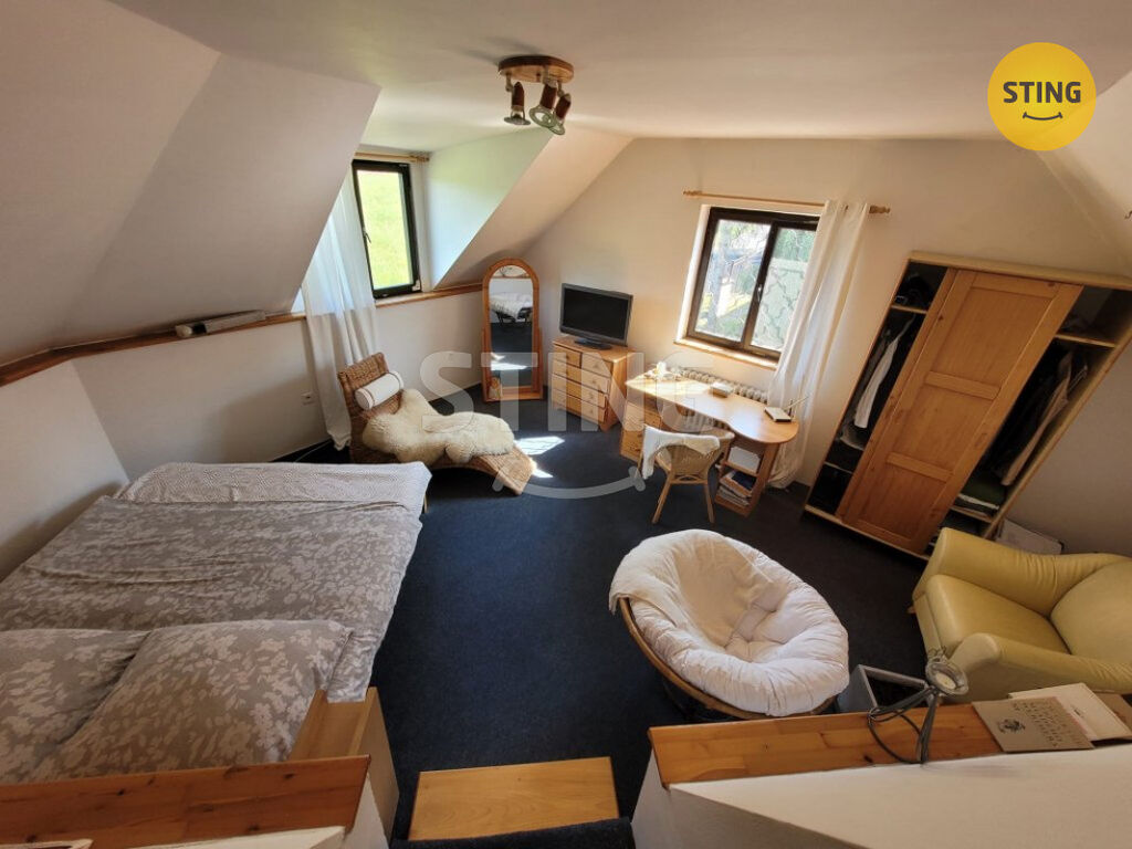Dům nabízí v obývacím pokoji posezení u krbových kamen, který zároveň vytopí prostor. Dřevěnými schody se dostaneme do spacího prostoru, kde je úžasný výhled na hory a do krajiny.  Ve dvou pojících se nachází spaní pro 5 lidí. Dále nad garáží vznikla dostavba a tento krásný prostor nabízí ložnici s relaxační zónou a spaním pro další 2 lidí.