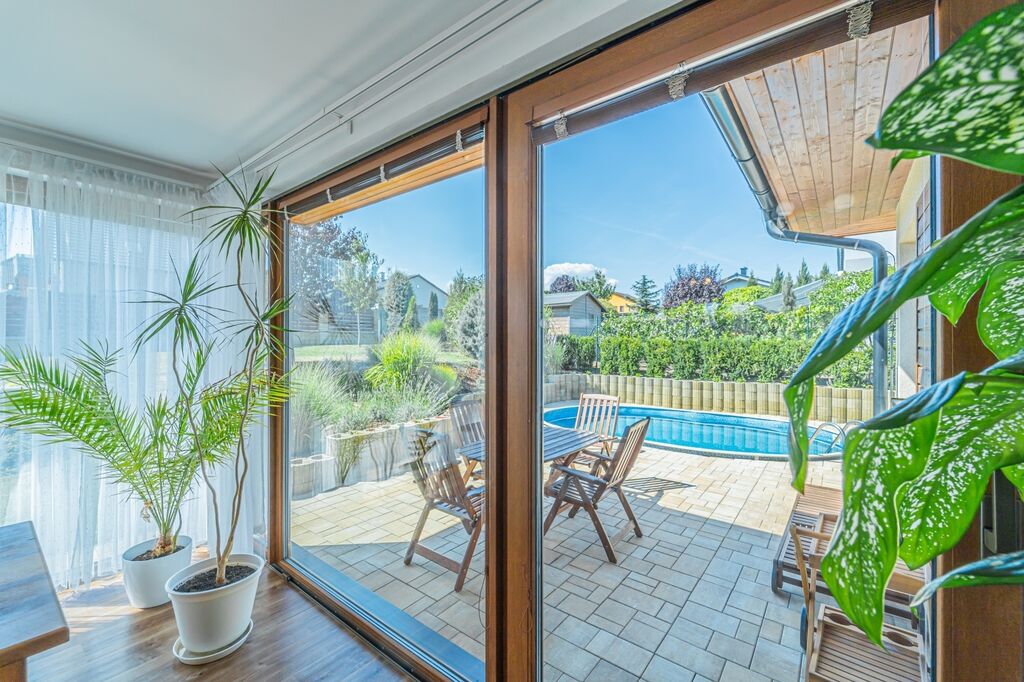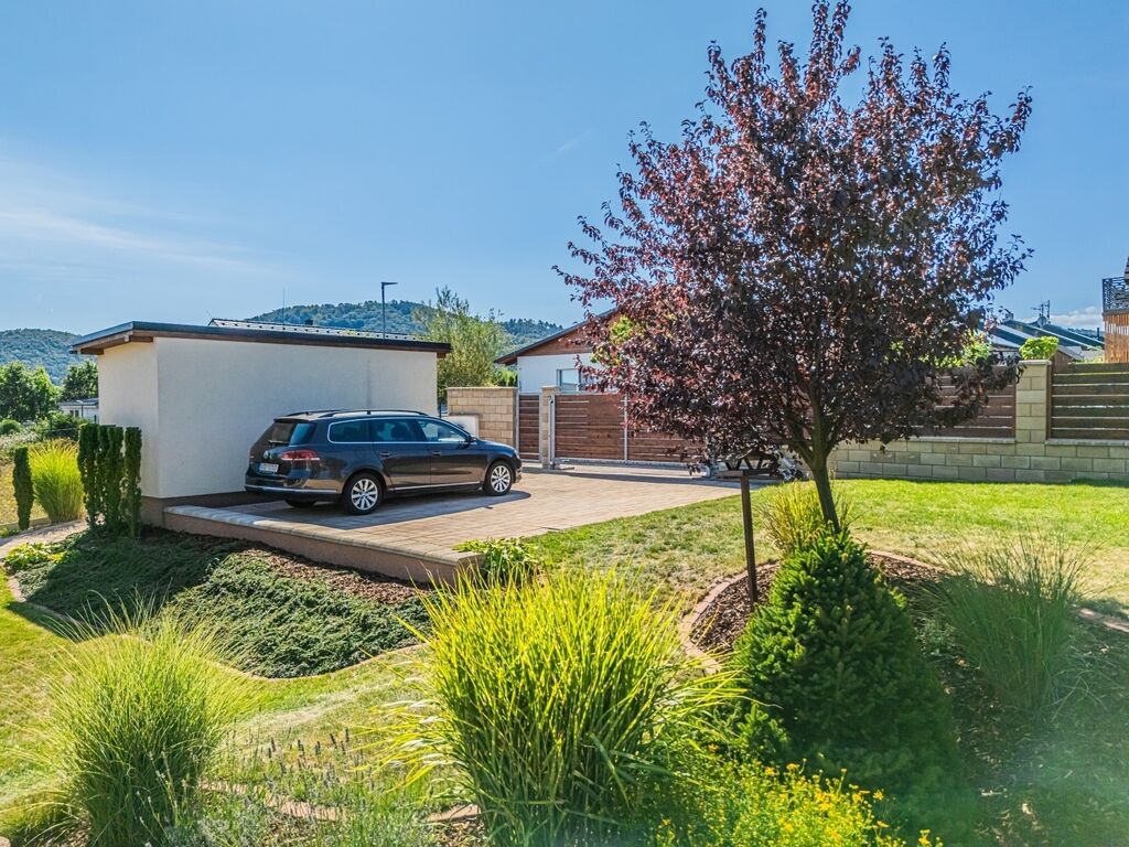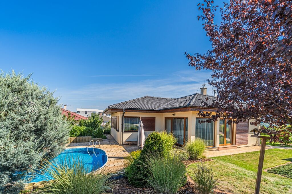 Součástí zahrady je zapuštěný bazén o objemu 18 m³ s rozměry 5,5 × 3,7 metru, pískovou filtrací a solární plachtou. U bazénu se nachází terasa s příjemným posezením, ideální pro letní odpočinek nebo rodinné grilování. Dále je na pozemku akumulační nádrž na dešťovou vodu o objemu 5 m³, podružný vodoměr pro zalévání, venkovní osvětlení a samostatný sklad o ploše 7,5 m². Vjezdová brána je vybavena elektrickým pohonem s dálkovým ovládáním a umožňuje komfortní parkování dvou vozidel na vlastním pozemku. Celý pozemek je oplocen a zahrada je osázena okrasnou zelení, která dotváří příjemnou atmosféru.
