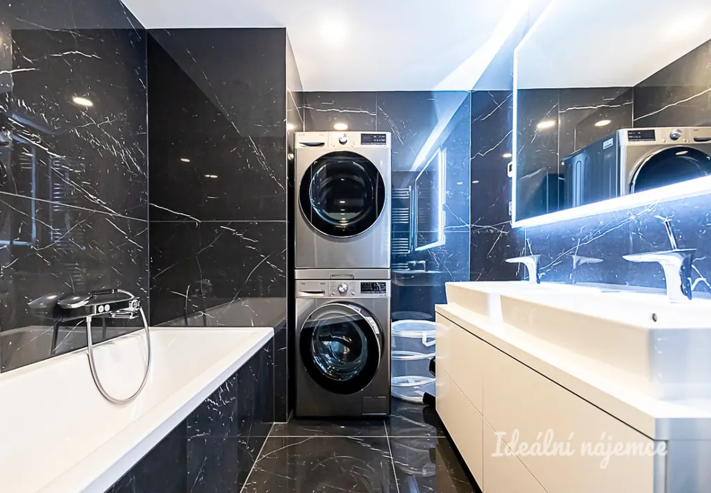 Byt je nabízen plně vybavený a připravený k okamžitému nastěhování. Kuchyně disponuje barovým posezením, lednicí s mrazákem, elektrickou i mikrovlnnou troubou, indukční varnou deskou, digestoří a myčkou. Na kuchyň plynule navazuje obývací pokoj s pohodlnou sedací soupravou, konferenčním stolkem, TV setem a jídelním koutem. V bytě jsou dále dva samostatné pokoje vybavené postelí, vestavěnou skříní a pracovním stolkem se židlí. Dominantou hlavní ložnice je luxusní manželská postel s čelem doplněná o vestavěnou skříň. Hlavní koupelna je zařízena vanou, umyvadlem, koupelnovou skříňkou a sušičkou, zatímco koupelna u ložnice nabízí sprchový kout a umyvadlo. Toaleta je samostatná.
