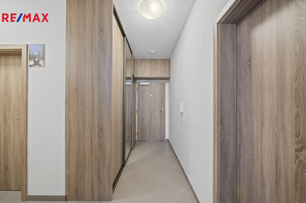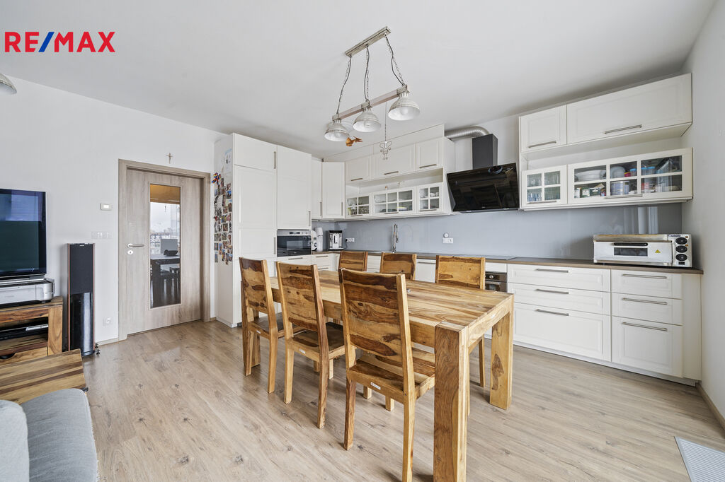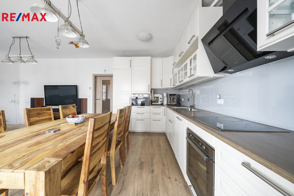 Byt je vybaven kuchyňskou linkou na míru včetně vestavných spotřebičů (lednice, mikrovlnná trouba, myčka, sporák, digestoř a varná deska). O dostatek úložného prostoru se postará vestavěná skříň a praktická komora.