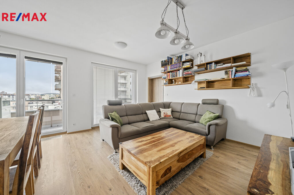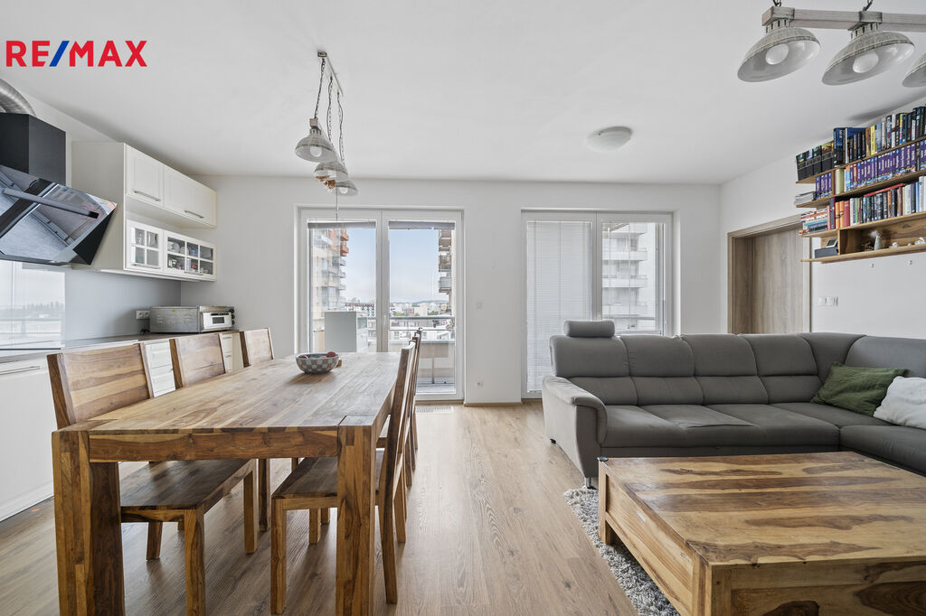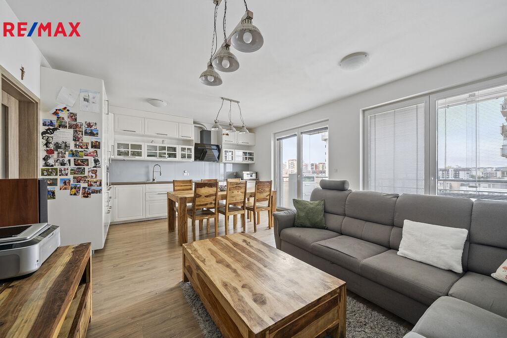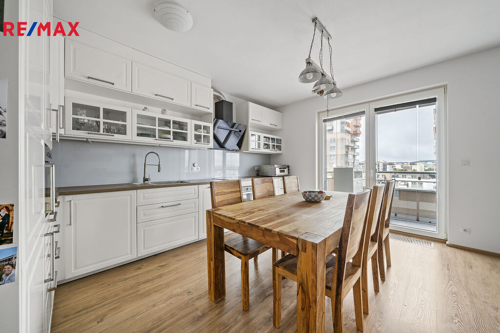 Nabízíme vám krásný byt o dispozici 4+kk o celkové ploše 115 m² (obytná plocha 93 m² + 2x balkon dohromady 16 m² + sklep 6 m²). Součástí bytu je také vlastní samostatná garáž v domě o výměře 30 m² a parkovací stání pro jedno vozidlo. Byt se nachází v 6. podlaží moderního bytového domu z roku 2018 v ulici Kadečkové v Letňanech.