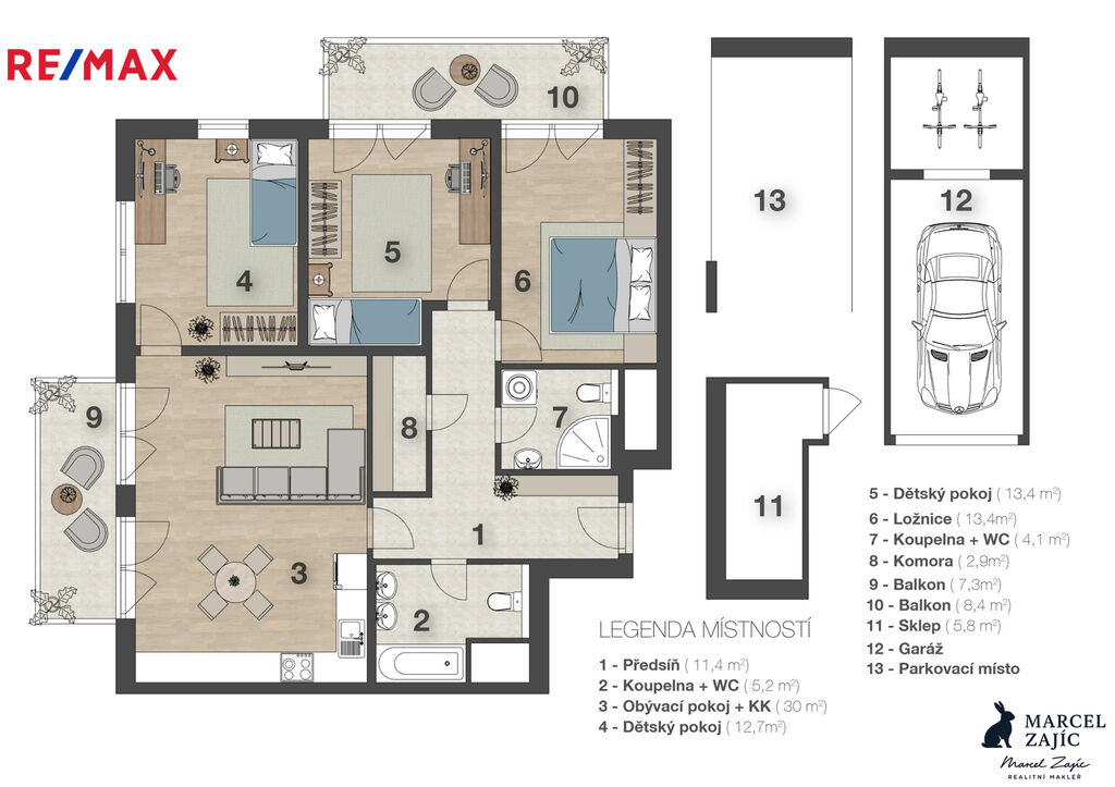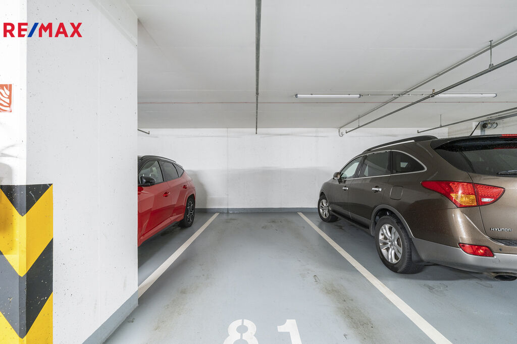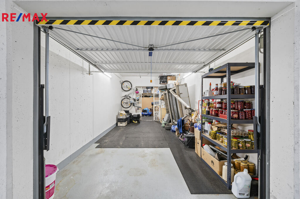 Velkou výhodou je garáž o ploše 30 m², do které pohodlně zaparkujete auto a zbyde vám dostatek místa i pro motorku. K bytu dále náleží sklep o velikosti téměř 6 m² a široké parkovací stání.