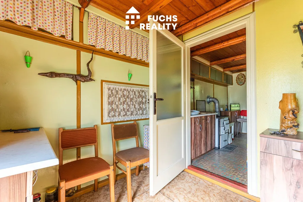 Dispozice chaty zahrnuje zádveří, obytnou místnost s kuchyňským koutem a podkroví s balkonem, odkud je krásný výhled do okolní přírody. Nechybí ani sklep, kolna a suché WC. Na pozemku je přípojka a rozvod obecního vodovodu, elektřina se nachází na hranici pozemku s možností napojení.