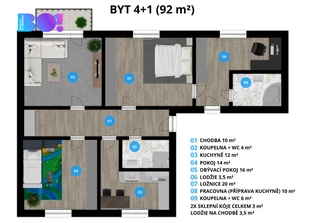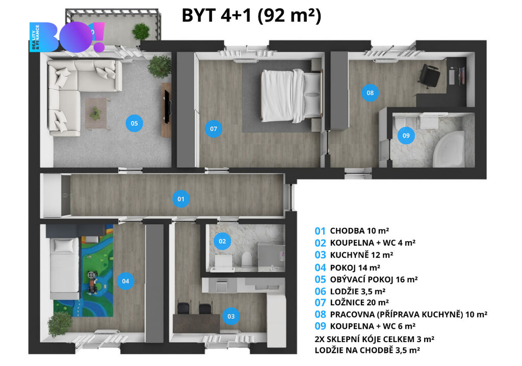 BO! Reality vám s radostí nabízí ke koupi prostorný a světlý byt 4+1 o velikosti 95 m², který vznikl propojením dvou bytových jednotek (1+1 a 2+1) na jednom patře.