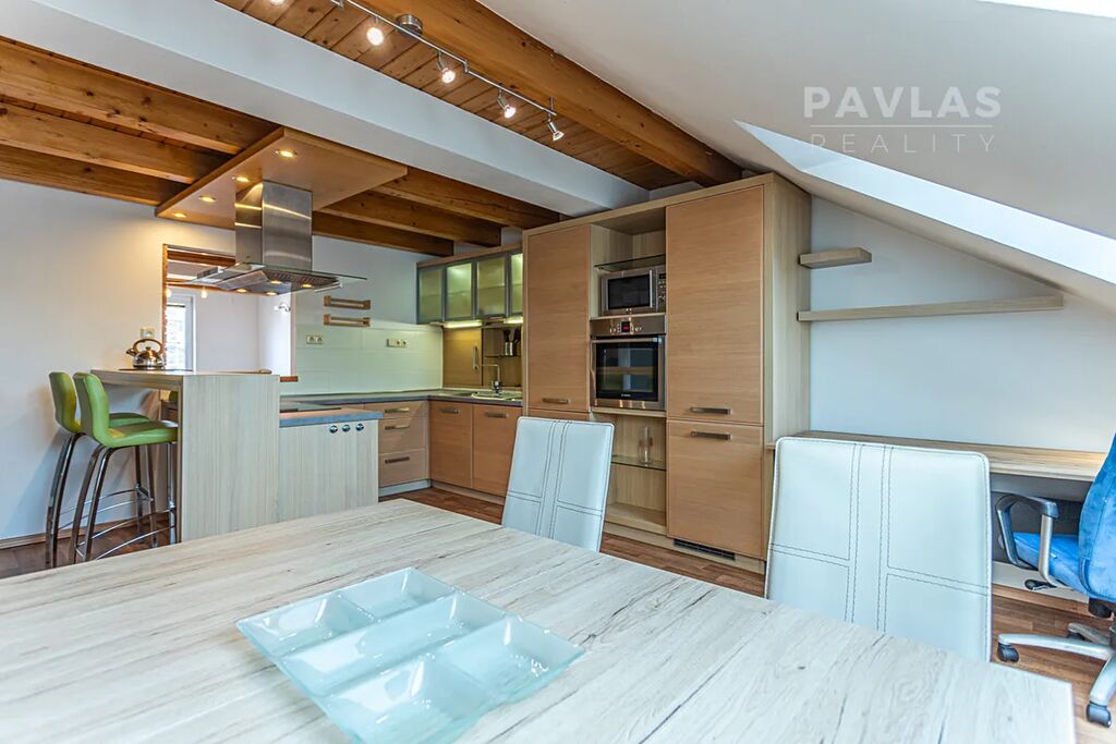 Zprostředkujeme k dlouhodobému pronájmu mezonetový byt 2+1 s rozlohou 94 m² s terasou 16 m², parkovacím místem a 3 m² sklepem. Tento vzdušný byt je vhodný pro jednotlivce, páry či rodinu. Nabízí nadstandardní úložné prostory, prostornou a plně vybavenou kuchyni ve tvaru U s nadstandardním úložným prostorem, relaxační koupelna s rohovou vanou, multifunkční horní patro se šatnou a pracovním koutem a terasu o velikosti 16 m² orientovanou na východ.
