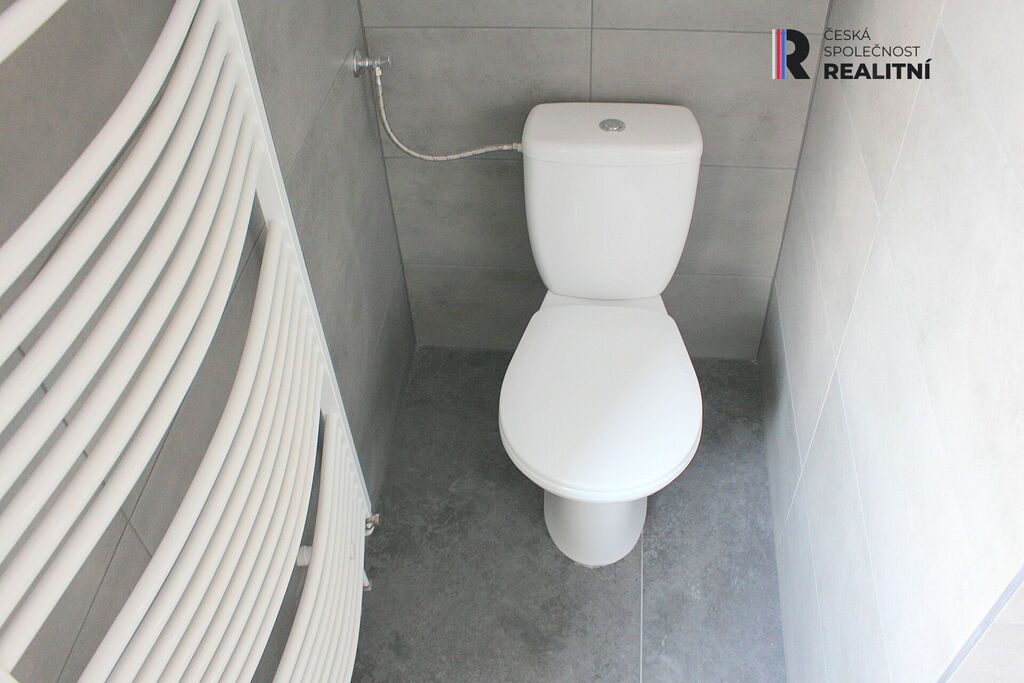 V patře, kam vystoupáte po dřevěném schodišti, jsou 2 ložnice a vstup do koupelny s vanou a WC.