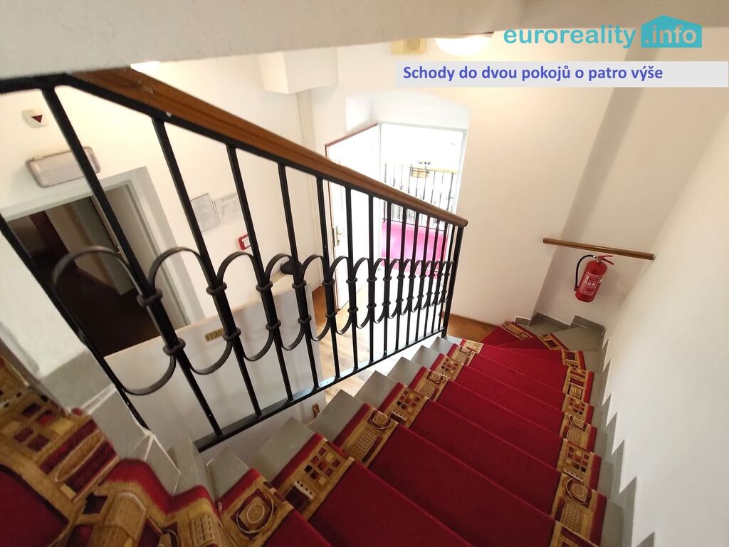 Pokoje jsou ve dvou úrovních. Ve spodní úrovni je jeden pokoj a kuchyně s výstupem do na balkon se schody do klidného vnitrobloku.