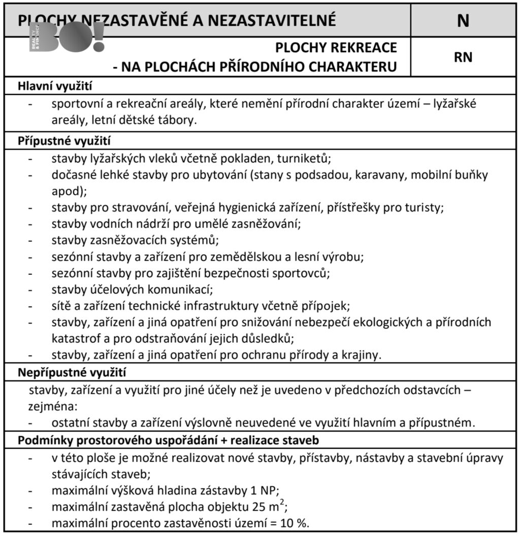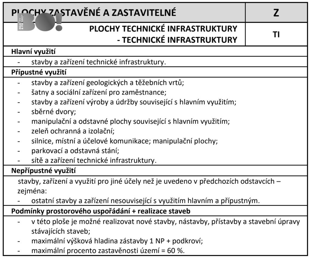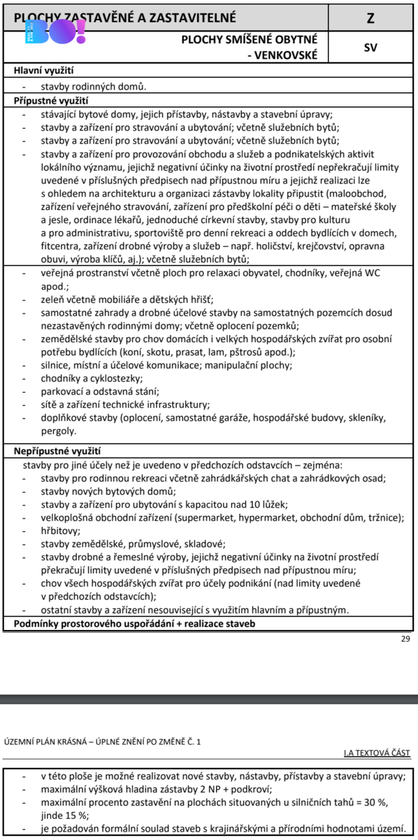 Samotné pozemky mají celkovou plochu 119.241 m² a skládají se dle územního plánu z různých ploch využití. Převládají zde plochy TI (technické infrastruktury), SV (smíšené obytné venkovské), RN (plochy rekreace na plochách přírodního charakteru) a plochy DS (plochy dopravní infrastruktury). Využití těchto ploch dle územního plánu naleznete mezi fotkami této nabídky.
