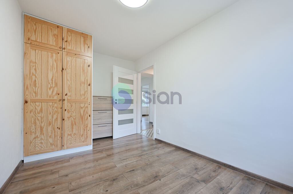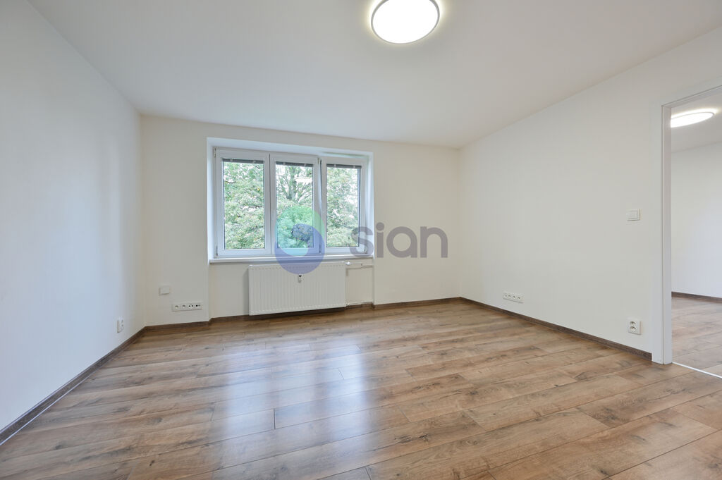 Byt byl po určitou dobu pronajímán, nyní je připraven k okamžitému nastěhování, i když si žádá několik drobných oprav. Dispozičně nabízí vedle kuchyně menší neprůchozí pokoj vhodný jako dětský pokoj nebo pracovna a prostorný obývací pokoj, který je průchozí do ložnice s výhledem do zeleně. Součástí bytu jsou také vestavěné skříně. Celkově působí interiér velmi světlým dojmem, a to i díky oknům orientovaným na dvě světové strany.