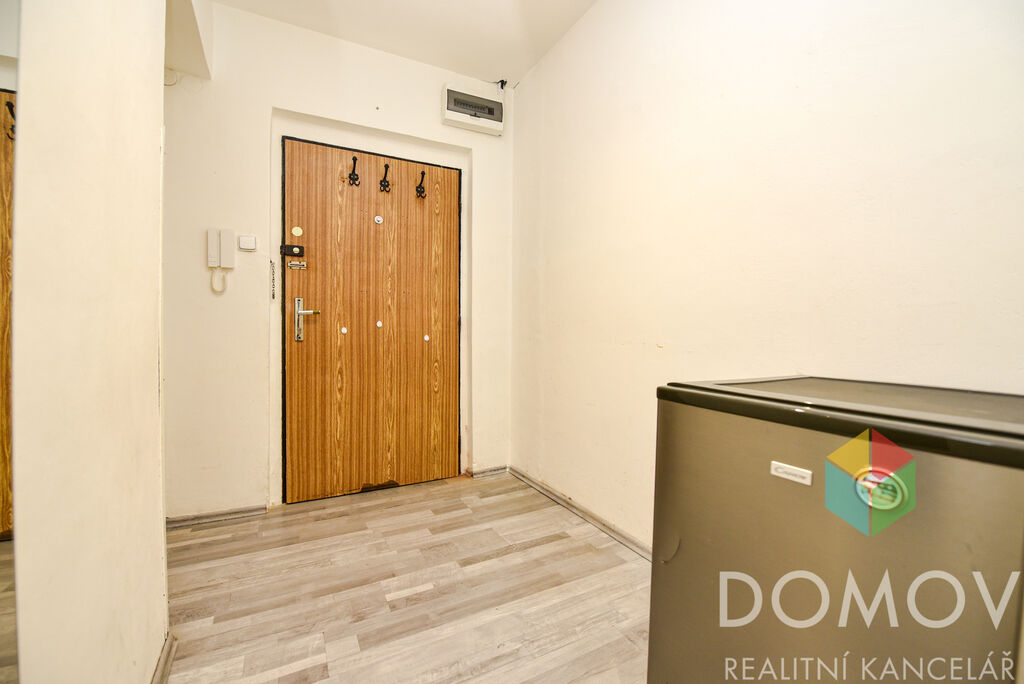 Vstupní chodba vede do prostorné koupelny s vanou a dále do světlé kuchyně s dostatkem místa pro jídelní stůl, gauč i televizní kout. Okno z kuchyně směřuje do zeleně.