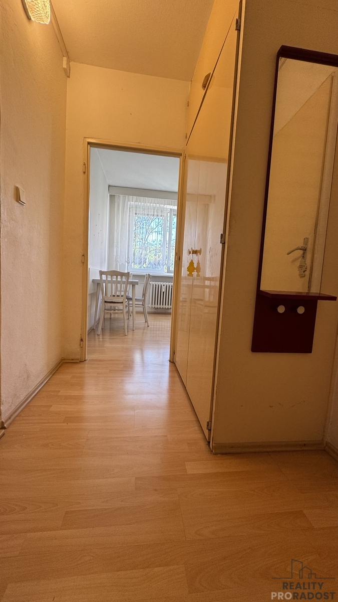 Byt je v původním, udržovaném stavu a je vhodný k okamžitému užívání, zároveň nabízí možnost rekonstrukce dle vlastních představ. Dispozice bytu zahrnuje prostorný pokoj s přístupem na balkón s výhledem do zeleně, kuchyň, koupelnu s WC a předsíň. K bytu náleží také sklepní kóje. Byt se prodává se zařízením který je na fotkách v případě potřeby lze vyklidit.