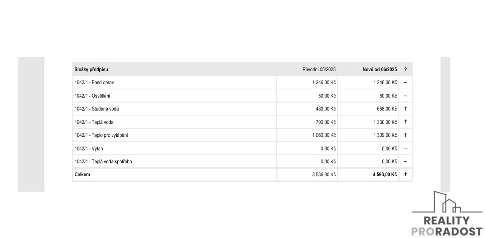 Náklady na bydlení jsou 4. 593 Kč pro 2 osoby z čehož fond oprav činí 1.246 Kč . Dům již nesplácí žádný úvěr.