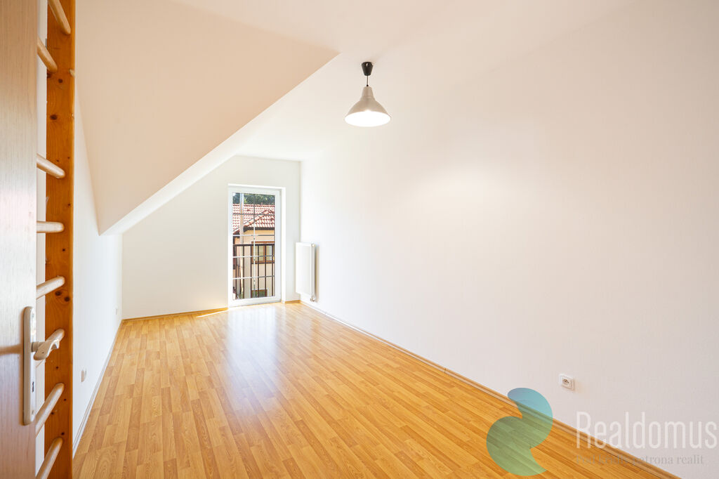 Byt se nachází ve druhém patře/podkroví malého zděného domu a nabízí komfortní a klidné bydlení s výbornou dostupností do města. Dispozičně je byt velmi prakticky řešen, najdeme zde velkorysý obývací pokoj s moderním kuchyňským koutem (31,6 m²), dvě ložnice (19,7 m² a 15,63 m²), koupelnu s vanou (4,4 m²), samostatnou toaletu (1,87 m²) a předsíň (7,7 m²). Kuchyňská linka je vybavena troubou, varnou deskou, digestoří a mikrovlnnou troubou.