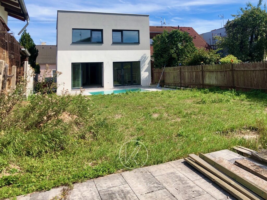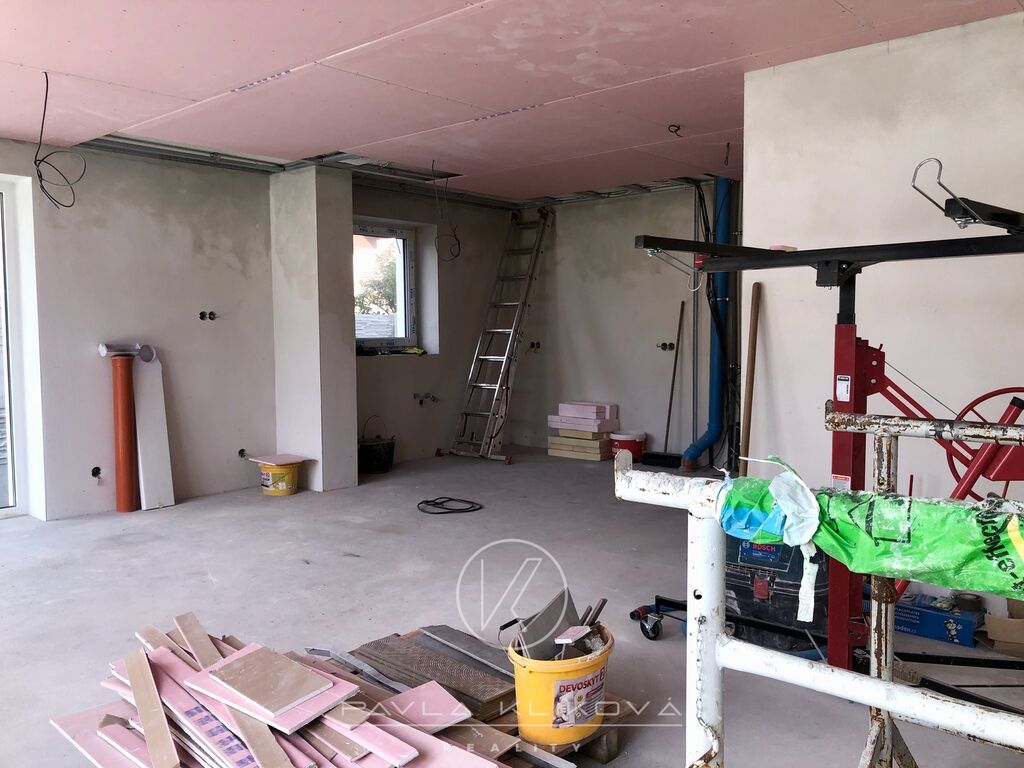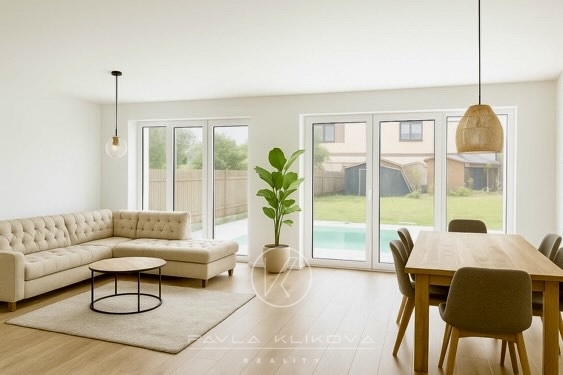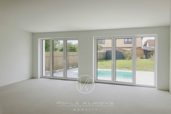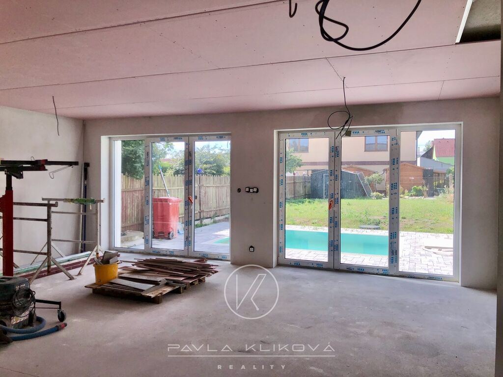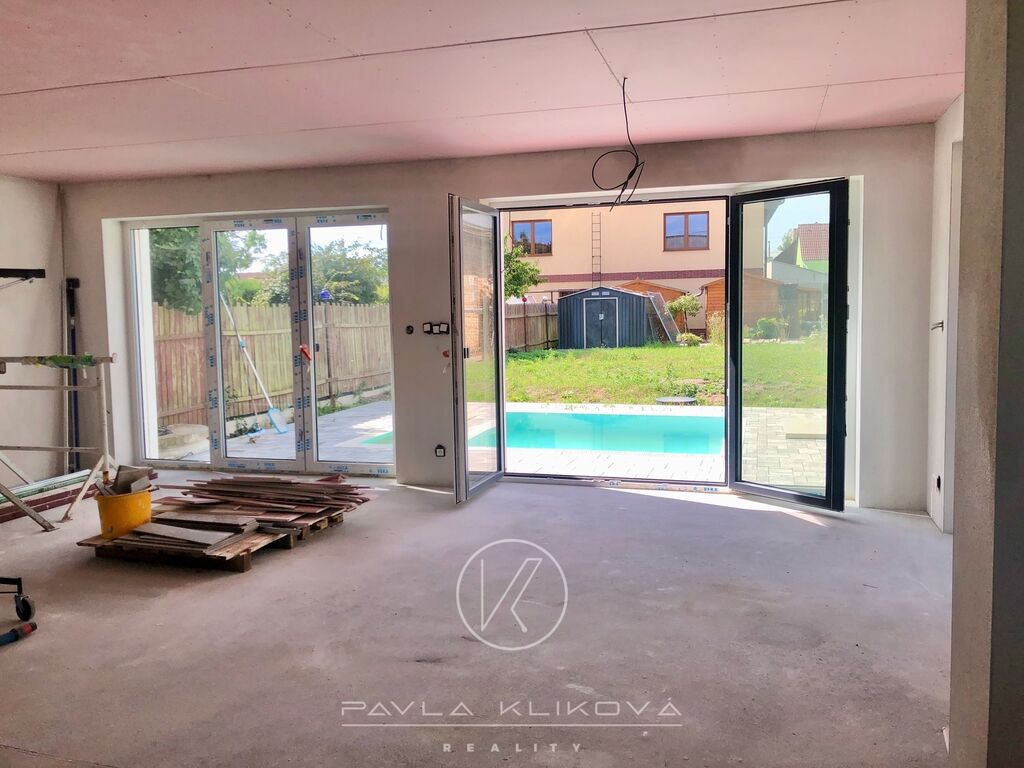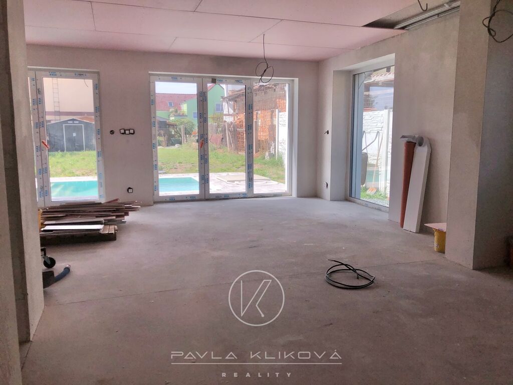 Moderní rodinný dům s bazénem, velkými francouzskými okny a možností dokončení podle vašeho vkusu. Prodej novostavby moderního rodinného domu s bazénem 5+kk, 129 m2, který je postaven na pozemku o výměře 349 m2 v Havlíčkově ulici v Tlučné. Dům je těsně před dokončením, můžete tedy ještě ovlivnit výběr podlah, obkladů, dveří a sanity.