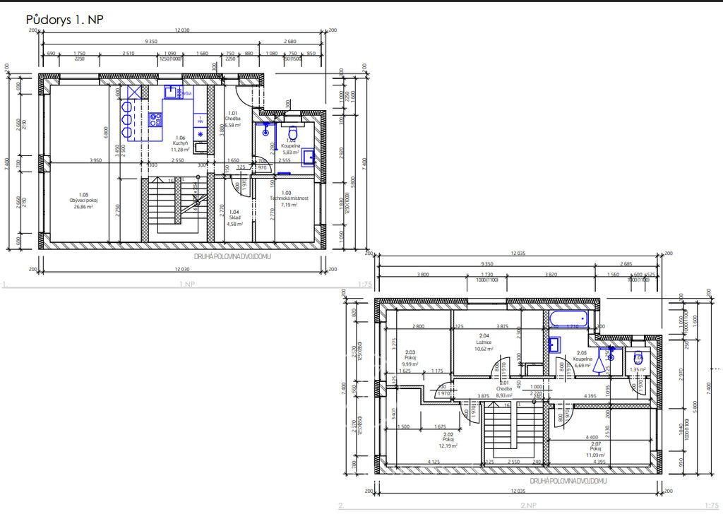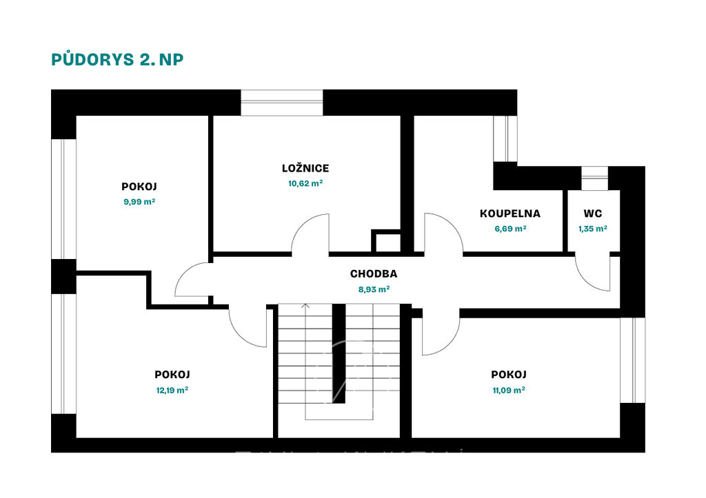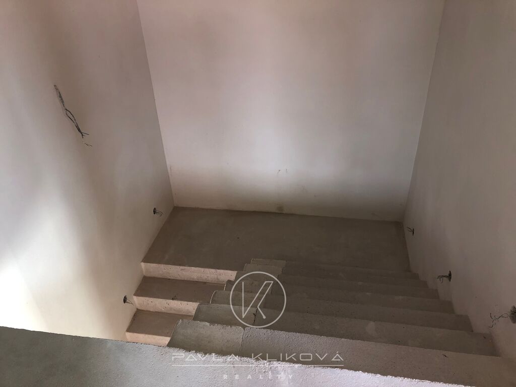 Dům je v prvním podlaží členěn na vstupní chodbu, WC s koupelnou, technickou místnost a obývací pokoj s kuchyňským koutem a spíží. Krásný prosklený prostor s výhledem na přelivový bazén 4,4 m2 x 3,4 m2. Velká francouzská okna nám umožní vstoupit přímo na terasu k bazénu a dále do zahrady. V patře najdeme 4 ložnice, koupelnu a samostatné WC.