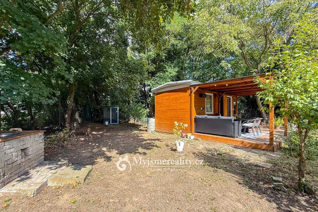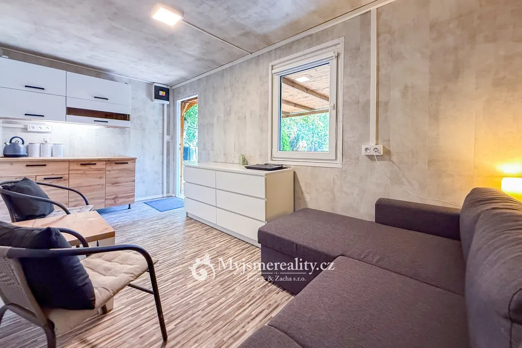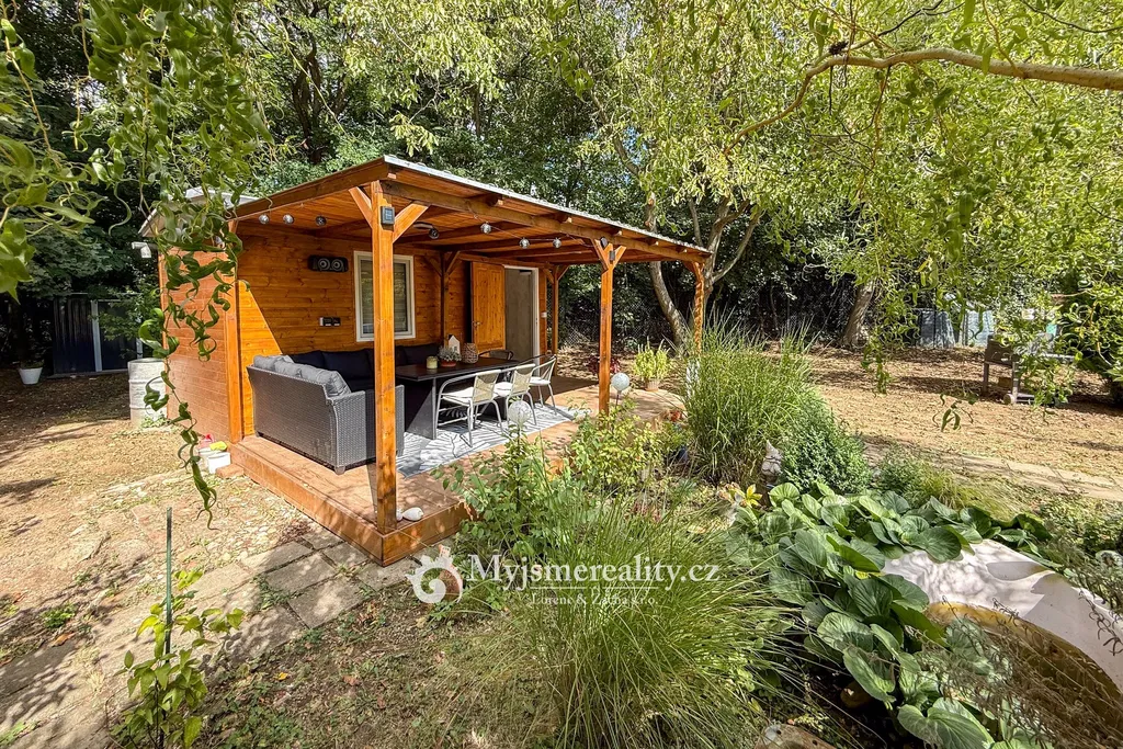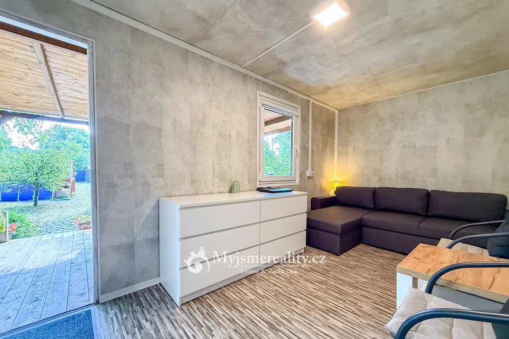 • zahradní chata vytvořená z unimobuňky, obložená dřevem, uvnitř s plastovým obkladem