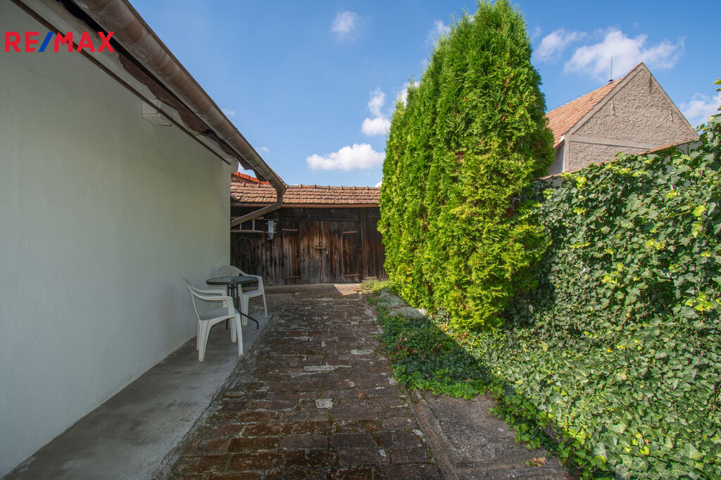 Pozemek a technické zázemí nemovitosti je napojené na obecní vodovod, kanalizaci, plyn i elektřinu. Na pozemku se nachází také studna a větší dřevěná kůlna. Menší zahrada je osázena vzrostlými thujemi, které zajišťují soukromí. Přístup na pozemek je možný brankou pro pěší nebo vjezdem pro auto. Před domem je pozemek s věcným břemenem chůze a jízdy pro zajištění přístupu k nemovitosti. Vedle domu je zbudované nové menší parkoviště. Ulice je jinak slepá (neprůjezdná) a díky tomu je zde klid.