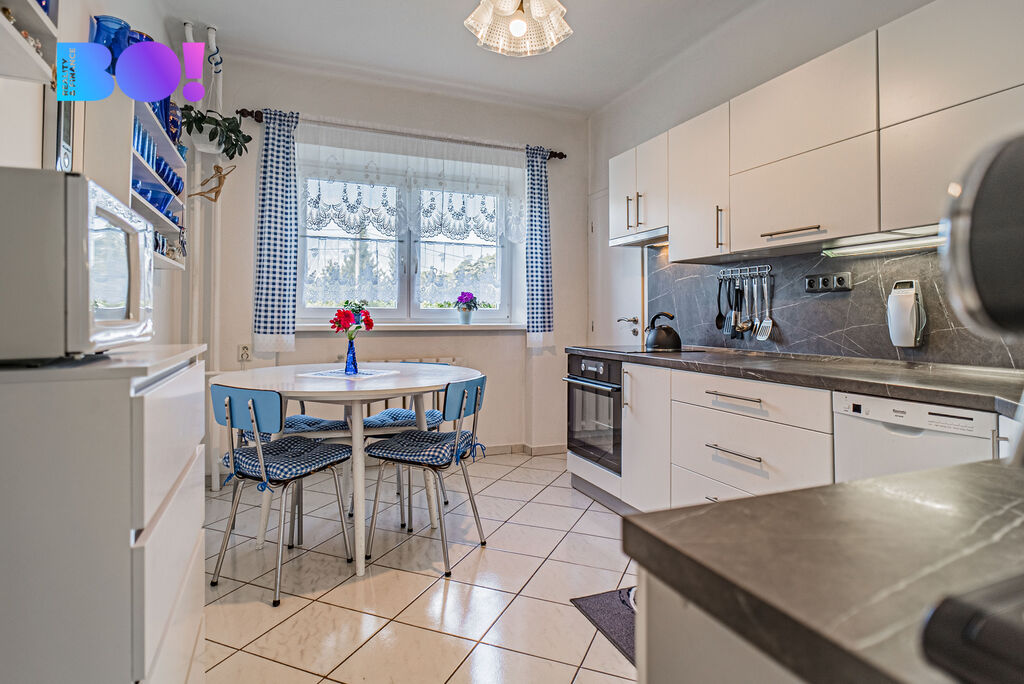 Přízemí (3+1): vstupní chodba, samostatné WC, koupelna, pokoj (např. jako kancelář či ložnice), zcela nová kuchyně se spižírnou, obývací pokoj s navazujícím dalším pokojem.