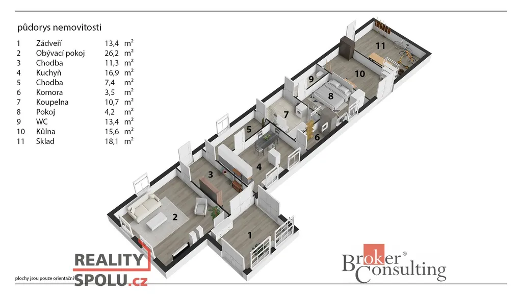 - Podkroví nabízí potenciál pro 2–3 útulné místnosti – ideální jako dětské pokoje, pracovna nebo hostinský pokoj.