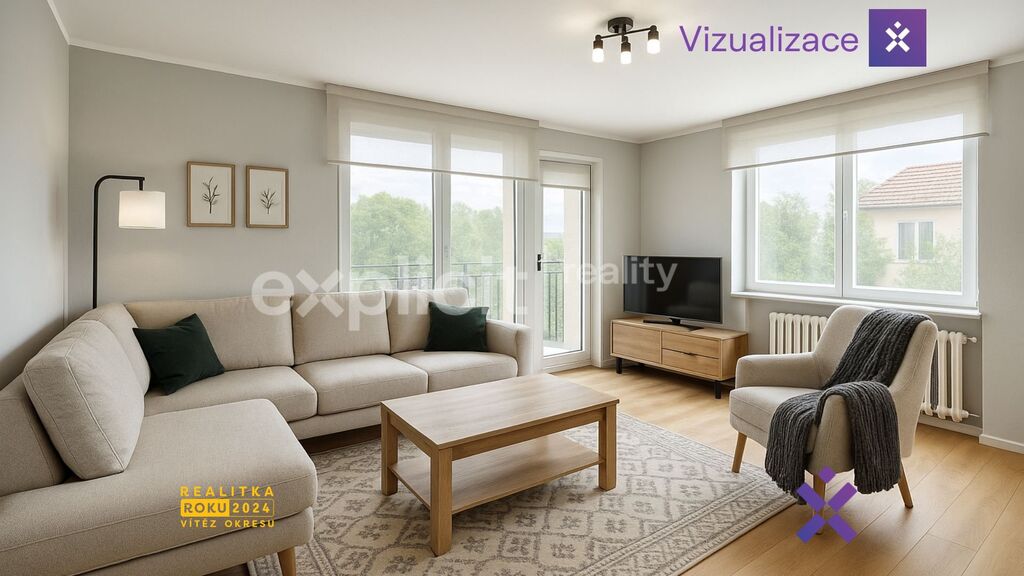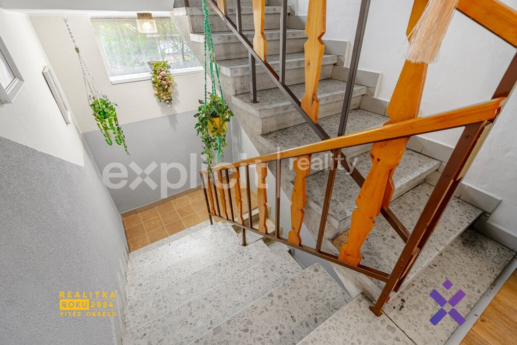 V patře se nachází samostatná kuchyně s jídelnou a vstupem na balkon, prostorný obývací pokoj s lodžií, ložnice s vlastní lodžií, dětský pokoj, koupelna a samostatné WC. V přízemí je k dispozici další pokoj vhodný jako pracovna nebo pokoj pro hosty, dále kotelna, koupelna s prádelnou a praktické skladové i menší sklepní prostory.