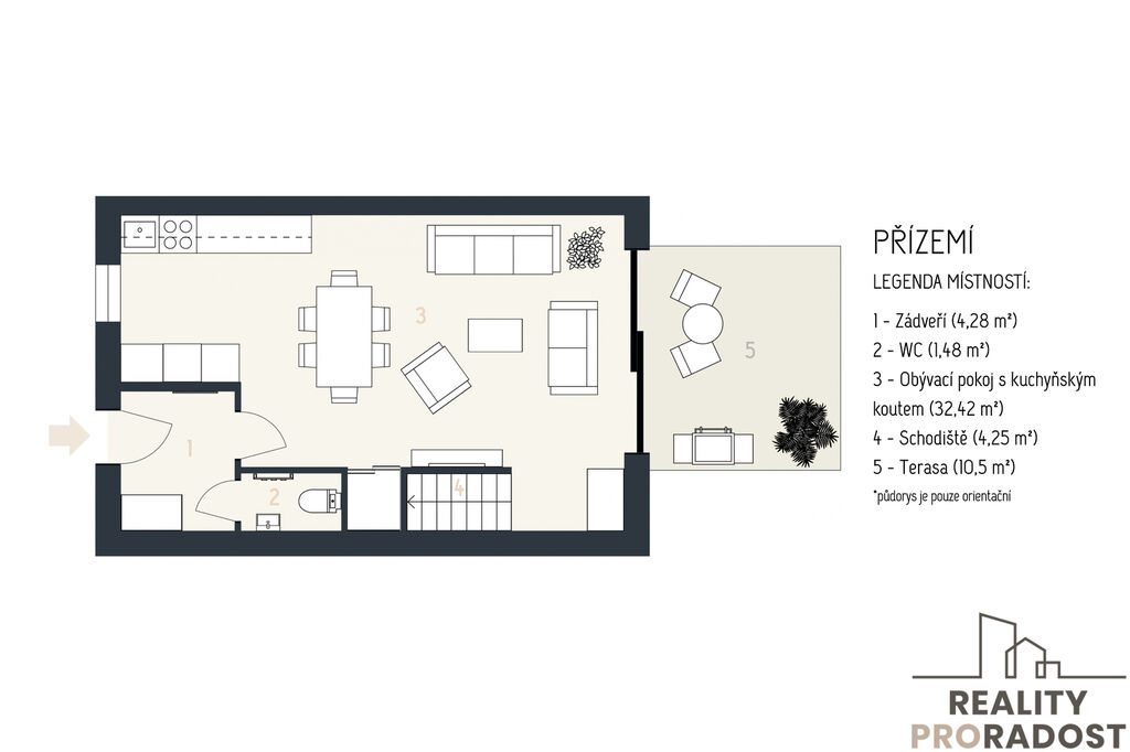 • prostorný obývací pokoj propojený s kuchyní a jídelním koutem
