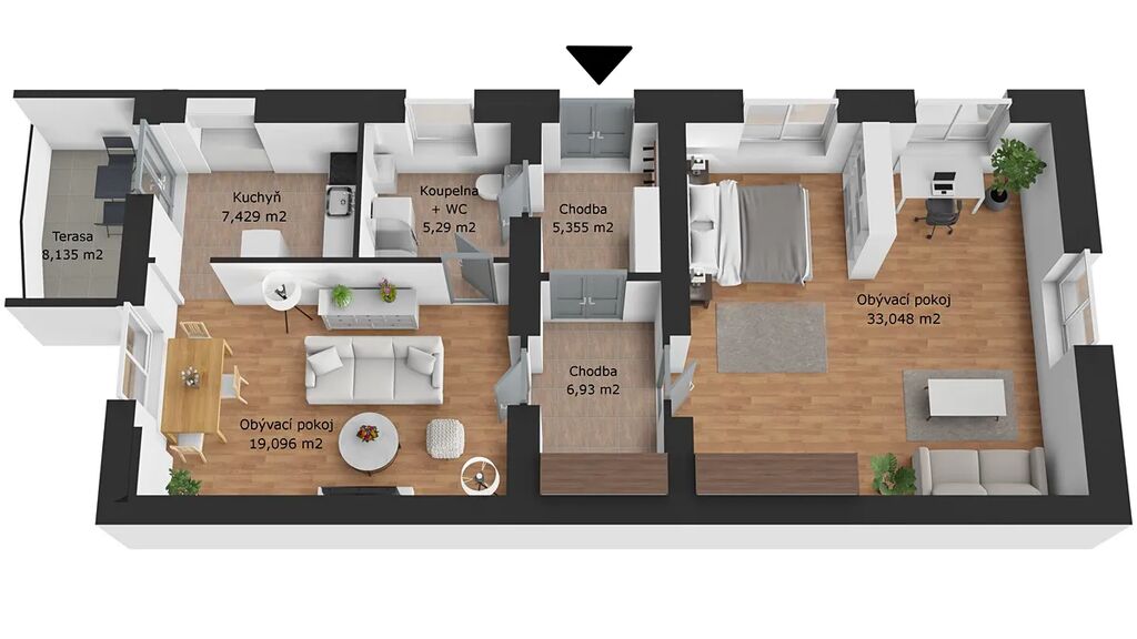 Dispozičně je byt řešen jako 2+1, má samostatný bezbariérový vchod, kterým se dostanete do vstupní haly, dále je další chodbou oddělena ložnice od obývací části, z které se dostanete do koupelny, do kuchyně a na terasu (8m2) z té se dá dále vejít do zahrady. K bytu náleží sklep a část půdy. U domu je k užívání domek (5m2) a část pozemku. Možnost parkování ve dvoře a nabídka přednostní koupě podsklepené garáže u domu.