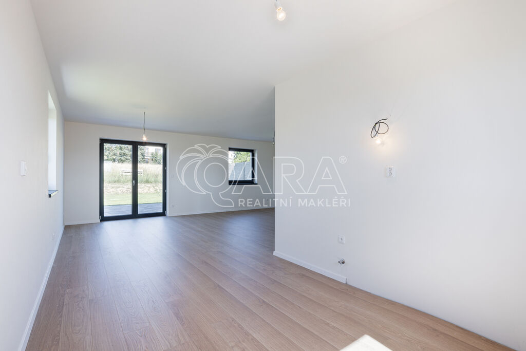 Dům je francouzským oknem v obývacím pokoji přirozeně propojen se zahradou o velikosti 348 m², jejíž součástí je na dům navazující 28 m² vydlážděná terasa, díky jejíž severní orientaci si můžete venkovní prostor užít i v horké a slunné dny. Zahrada je kompletně oplocená, zatravněná a čeká na případné finální úpravy od nových majitelů. Akumulační nádrž (3 m3) pro budoucí hospodaření s dešťovou vodou je již na pozemku umístěna.