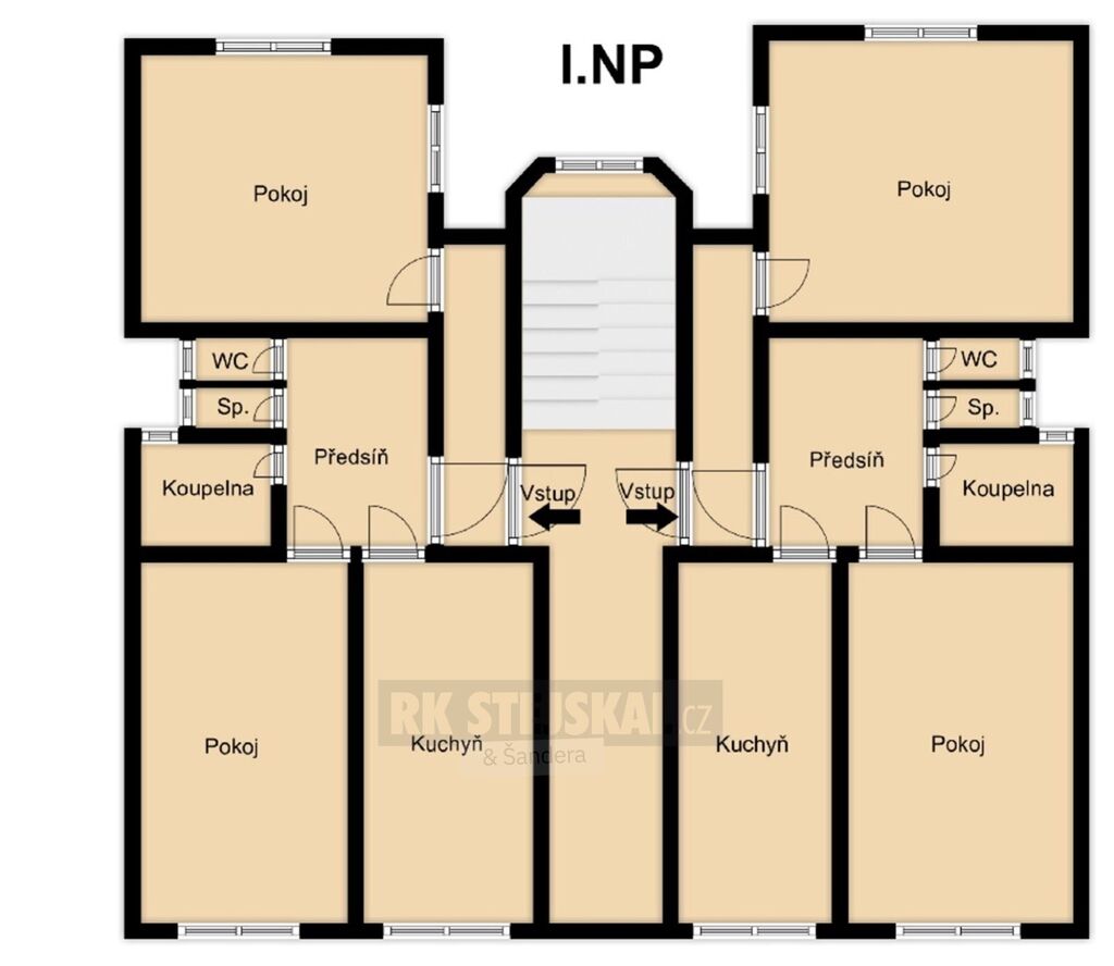 1. nadzemní podlaží: dvě bytové jednotky o velikosti 64 m², ideální pro dlouhodobý pronájem nebo rekonstrukci na moderní menší byty,