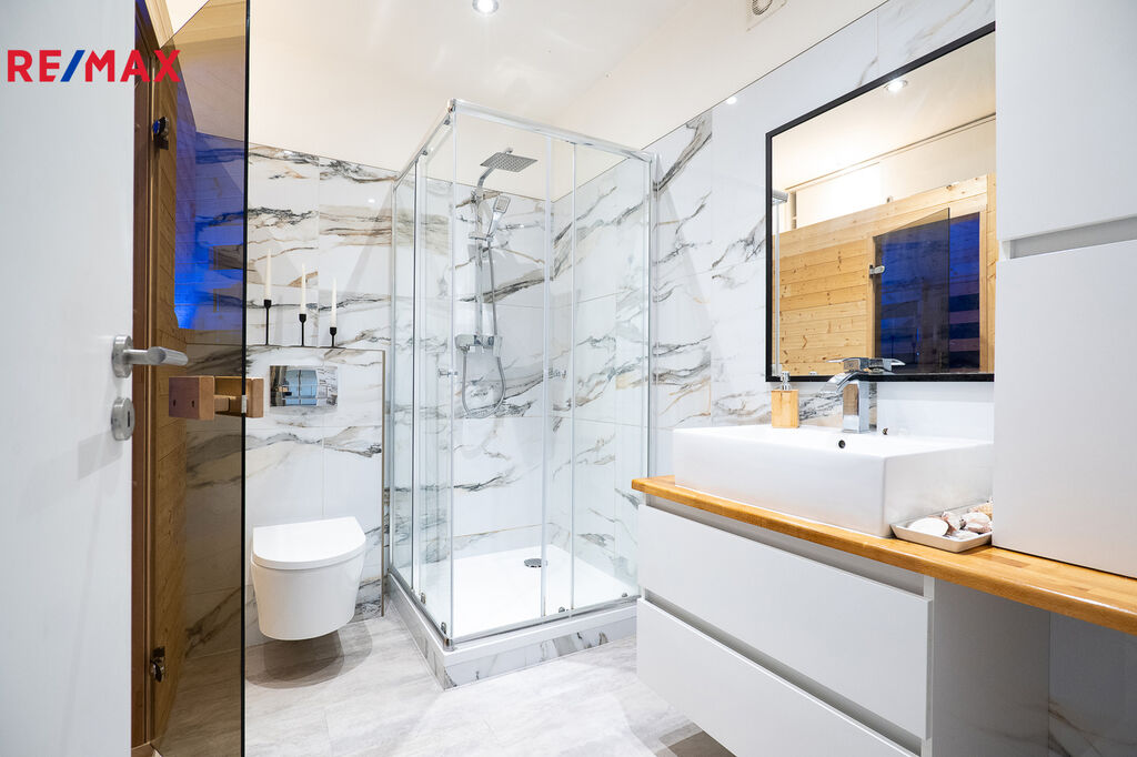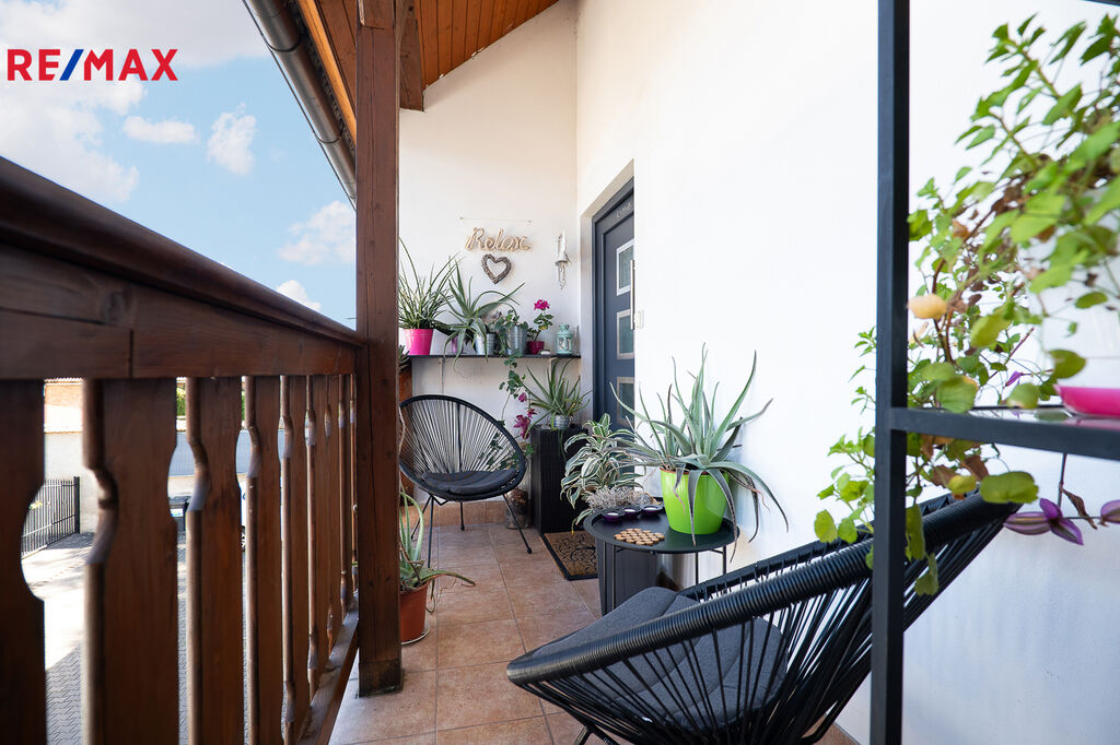 Byt je situován v prvním podlaží a v podkroví.  Přístup vede přes schodiště a zastřešenou pavlač, vstup vede z předsíně dok prostorné obývací místnosti (24,96 m²)  spojené s kuchyní (11,5 m²) s oknem a novou kuchyňskou linkou (r. 2017) kompletně vybavenou spotřebiči. Na tomto podlaží se nachází ještě prostorná šatna (10 m2)  a ložnice (14,78 m2). Komfort poskytuje moderní koupelna se sprchovým koutem, umyvadlem, vestavěným nábytkem a infrasaunou.