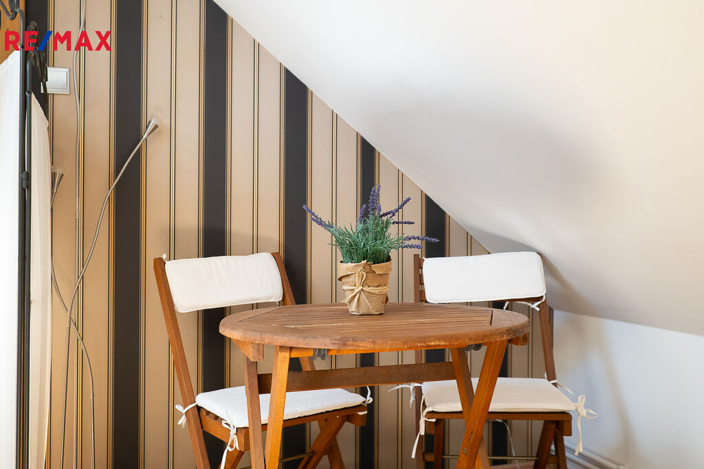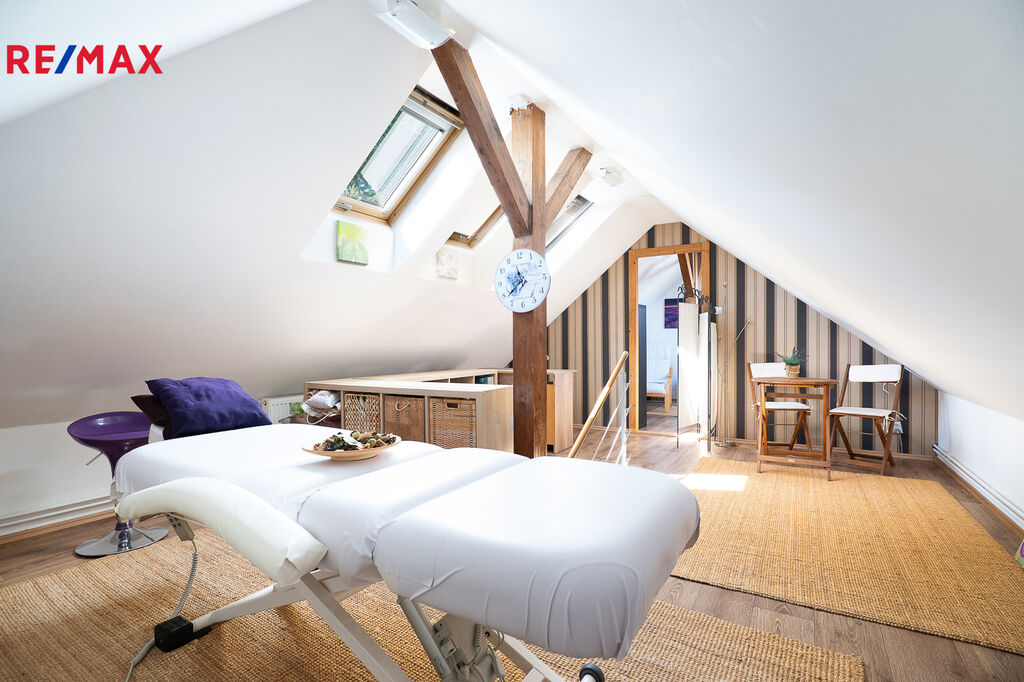 Dřevěné točité schodiště z masivního buku vede do podkroví, kde se nachází dvě ložnice, aktuálně využívané jako pracovna majitelky. Je zde možnost instalace druhé koupelny.  Celková podlahová plocha podkroví je 39,7 m².