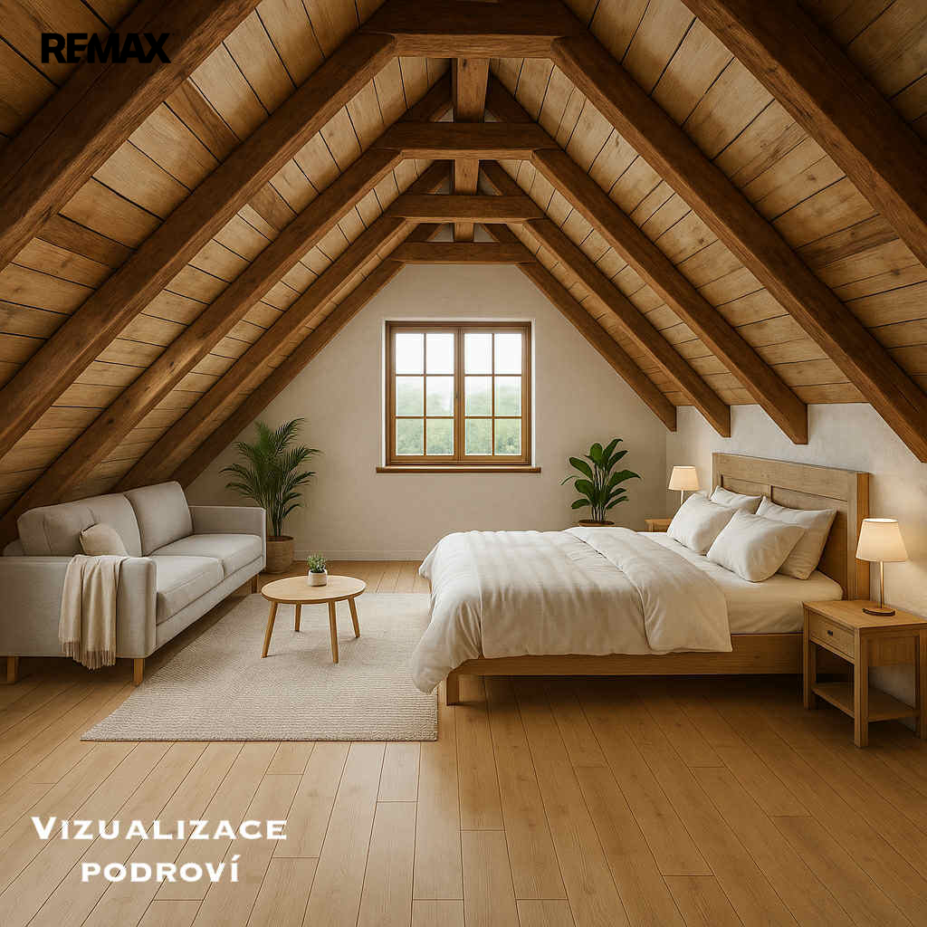 Součástí domu je rozsáhlé podkroví po celé jeho délce, které doslova vybízí k dalšímu využití. V jedné části je díky dostatečné výšce trámů prostor připravený k okamžité přeměně na útulný pokoj, a navíc je zde možnost vybudovat elegantní schodiště přímo ze spodní místnosti.