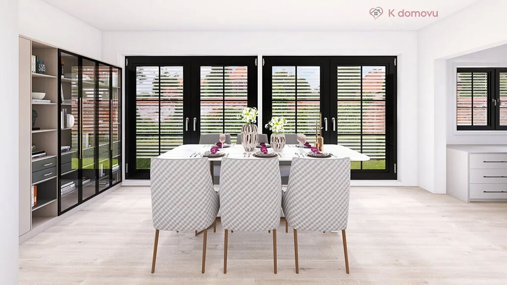 * Francouzská okna: Velkorysá francouzská okna v 1. a 2. NP s přímým vstupem a výhledem do zahrady, prosvětlující interiér a propojující obytný prostor s exteriérem, materiál hliník s trojskly.