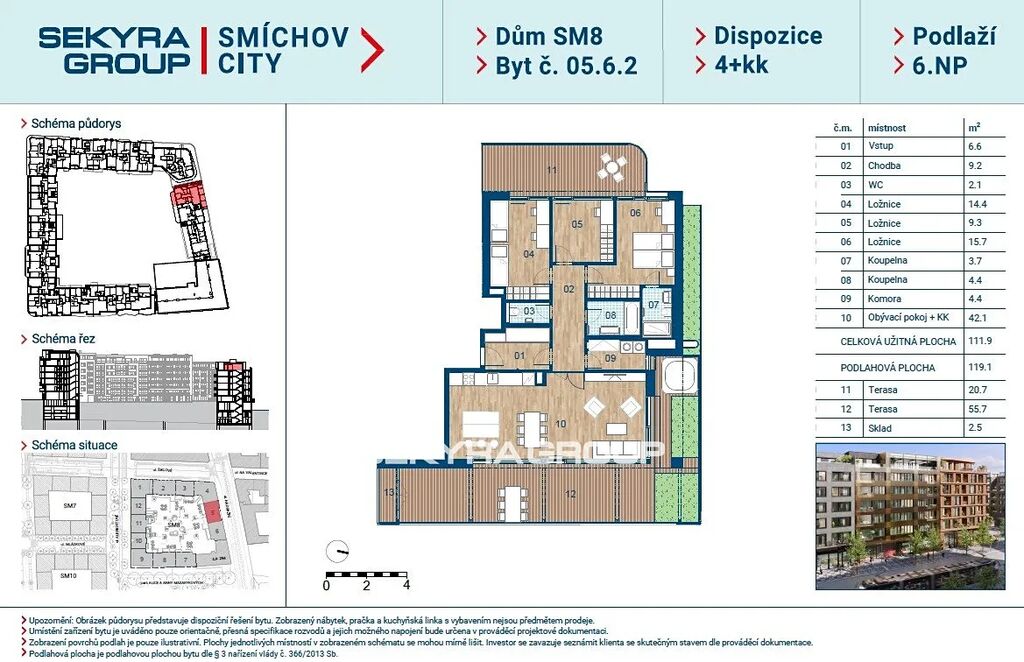 Dovolujeme si Vám nabídnout k prodeji byt 4+kk o výměře 119,1 m² s terasou 78,9 m² v rezidenčním projektu Smíchov City, blok SM8.