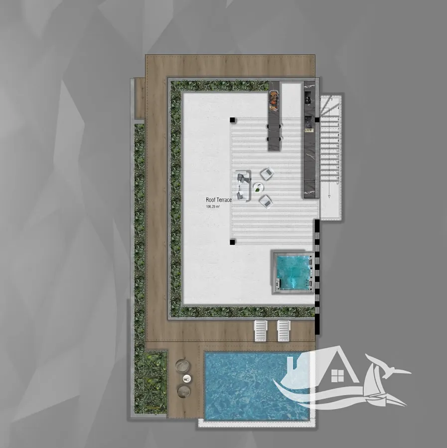 V projektů zůstalo pouze par vil v první linii , vila 3+kk má dvě ložnice, dvě koupelny , velká střešní terasa a bazén.