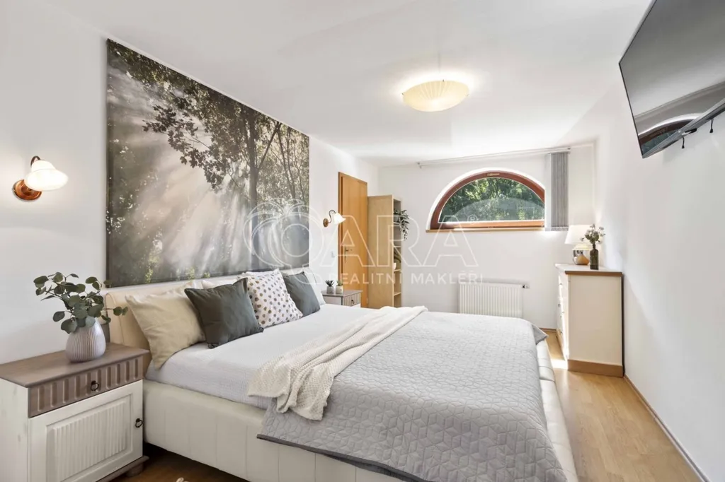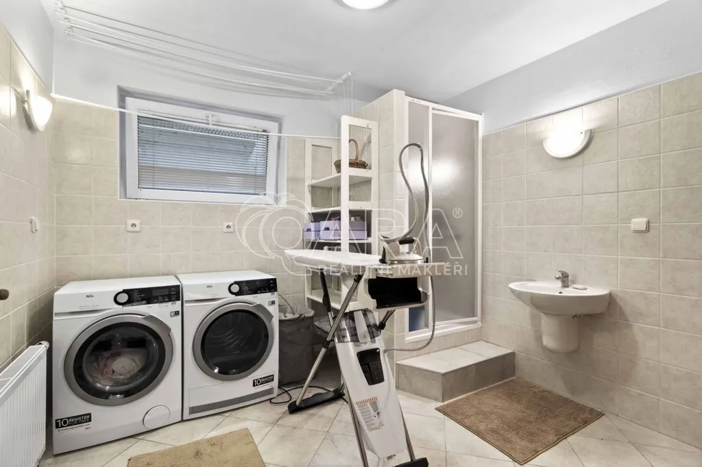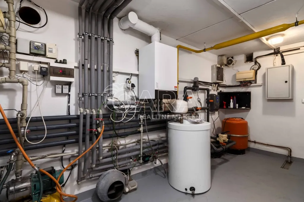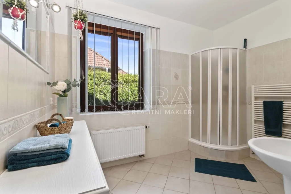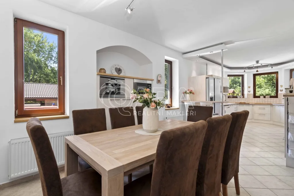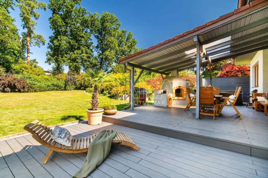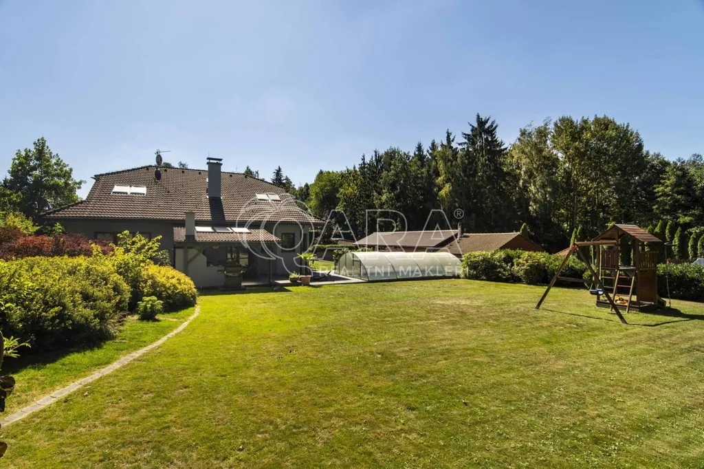 Pozemek o rozloze 1748 m obklopený lesem je víc než jen místo k posezení. Bazén, vířivka, pergola, venkovní krb s posezením, malé dětské hřiště, a pokud vám nestačí téměř čtyřicetimetrová uzavřená dvougaráž, protože máte trochu větší vozový park nebo třeba karavan, vejdete se na pozemek pohodlně i s vašimi dalšími motorovými mazlíčky. Všechno tu má svoje místo.