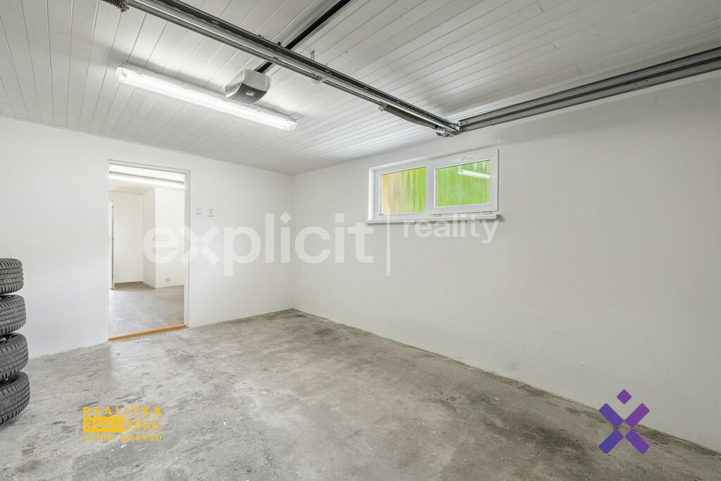 Součástí nemovitosti jsou dvě prostorné podsklepené garáže s úložným prostorem pro nářadí a zahradní vybavení. Na garáže navazuje terasa s posezením, ideální místo pro letní grilování nebo klidné večery s rodinou.