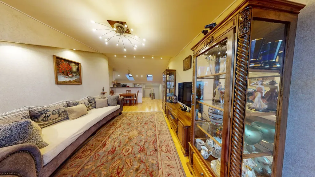 Dominantou bytu je prostorný obývací pokoj s moderní kuchyní cca 33 m and sup2; a vstupem na balkon / terasu cca 7,5 m and sup2;, odkud se otevírá jedinečný výhled na město.