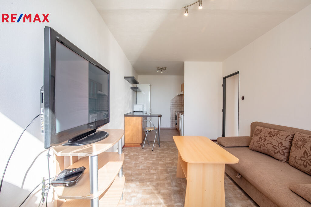 Byt prošel částečnou rekonstrukcí a je plně vybavený – stačí se jen nastěhovat. Kuchyňský kout disponuje lednicí, elektrickým sporákem se sklokeramickou deskou, pračkou a praktickým barovým pultem pro stolování. Obývací pokoj je zařízen sedací soupravou a televizí, v ložnici se nachází postel, skříň a komoda. Ve vstupní chodbě oceníte velkou šatní skříň. Podlahy tvoří kombinace dlažby a koberce.