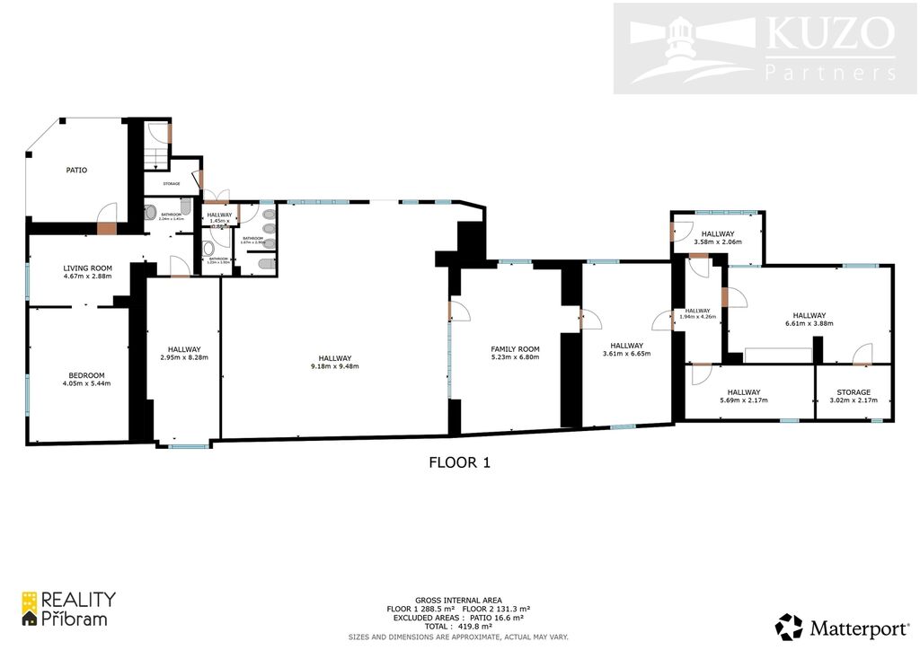 •	Hlavní budova: Přízemí o rozloze 289 m² a prostorný byt 4+1 v prvním patře (131 m²).