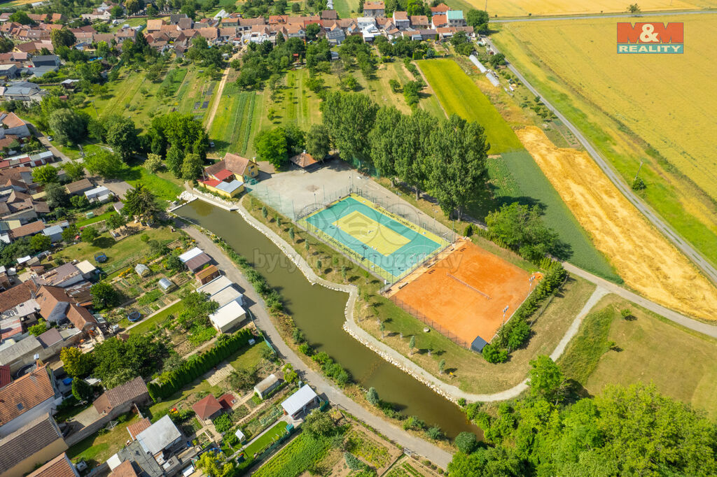 Zahrada jako ovocný sad, za kterým se nachází část biotopu a tenisové hřiště.