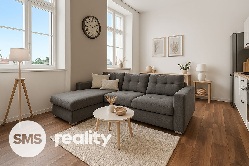 Dispozice bytu nabízí vstupní chodbu s dostatkem úložného prostoru a novou vestavěnou skříní, prostornou koupelnu s vanou, umyvadlem, toaletou a topným žebříkem a dále hlavní obytnou místnost s kuchyňským koutem. Kuchyně je propojena s obývací částí, čímž vzniká vzdušný a útulný prostor pro každodenní život.