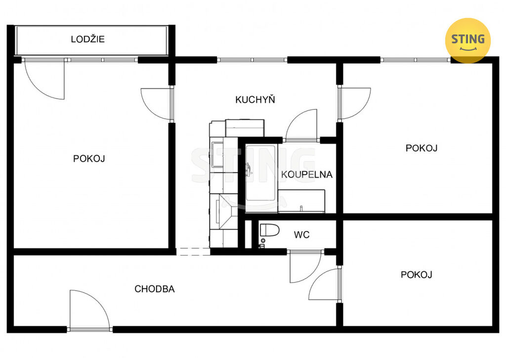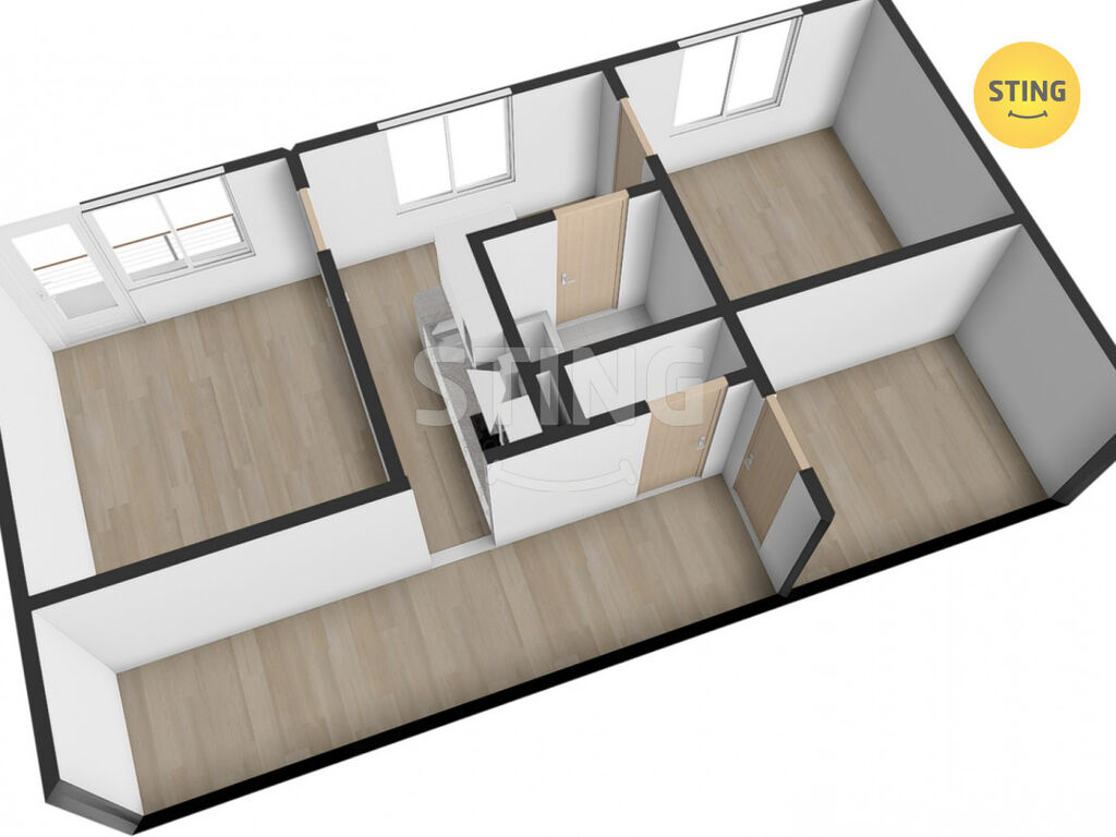 Dispoziční řešení: kuchyně ( 12,04 m2), pokoj ( 16,19 m2), pokoj ( 12,01 m2), pokoj ( 8,34 m2), předsíň ( 8,38 m2), koupelna ( 2,56 m2), WC ( 0,91 m2), sklep ( 2,60 m2), lodžie ( 3,80 m2).